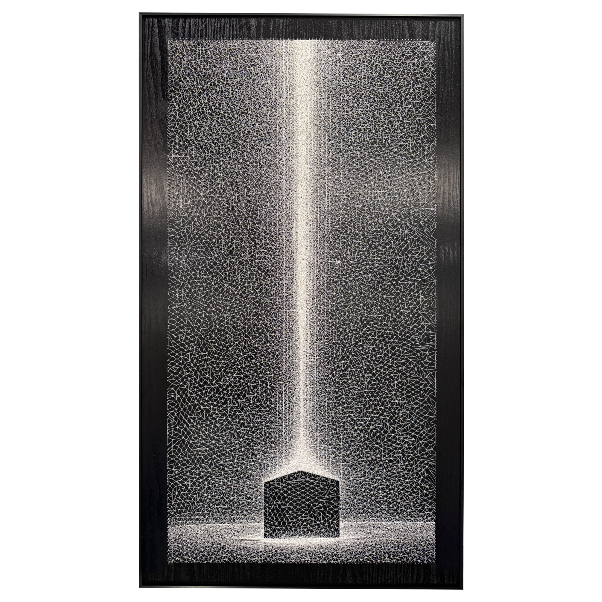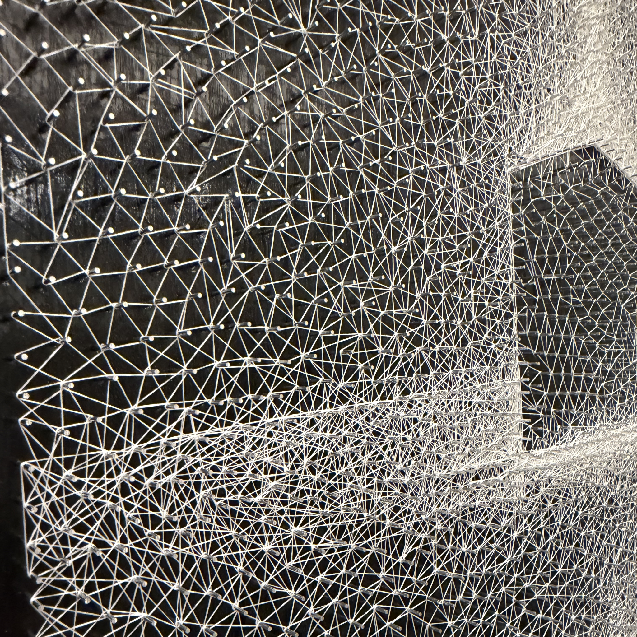 One continuous thread is guided over thousands of hand-set nails to form intricate detail. Mounted on a sustainably sourced wooden board, the interplay of metal, fibre, and grain creates natural depth and contrast.