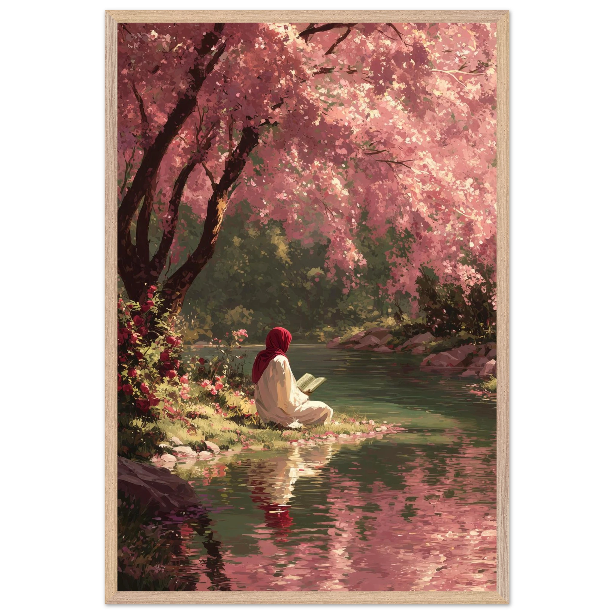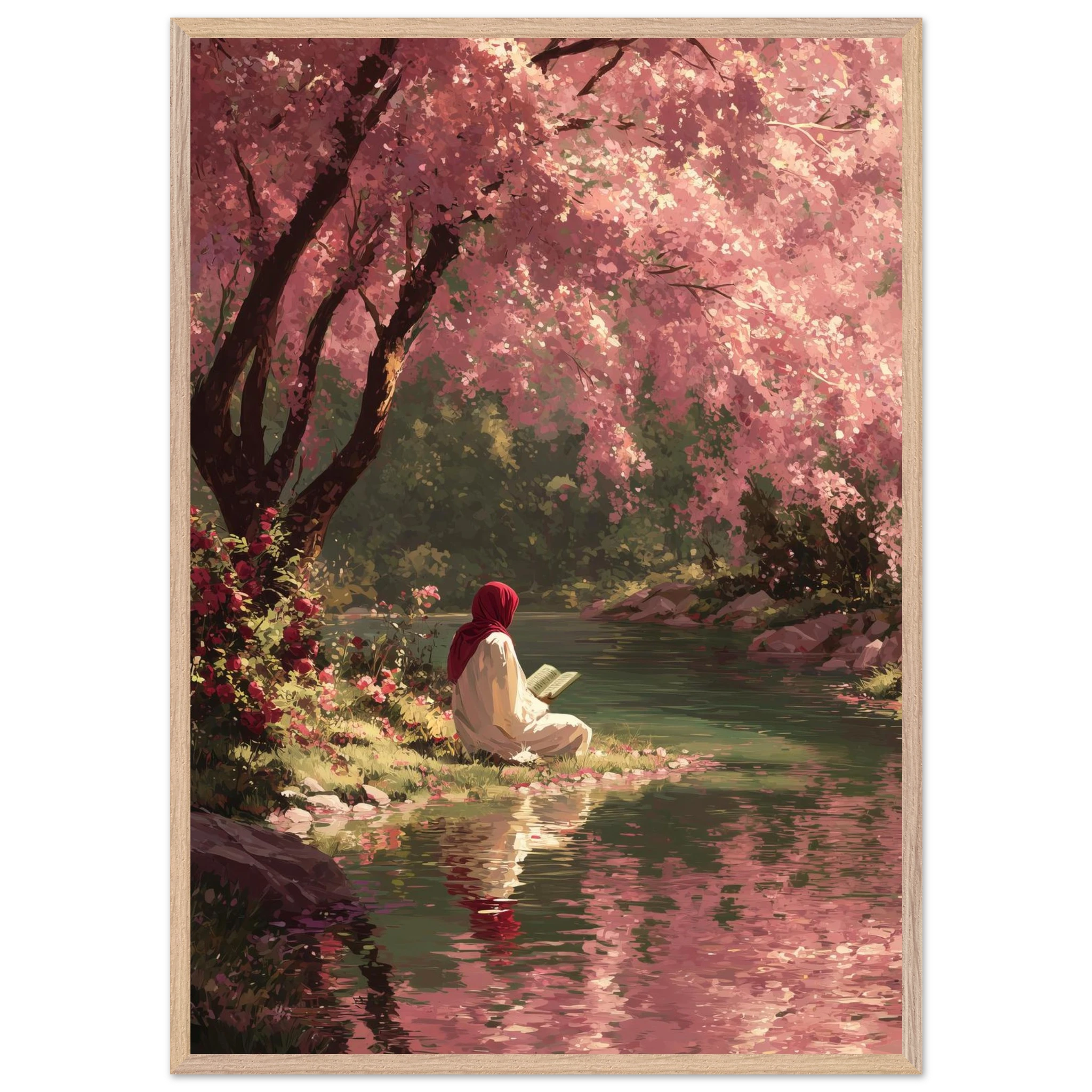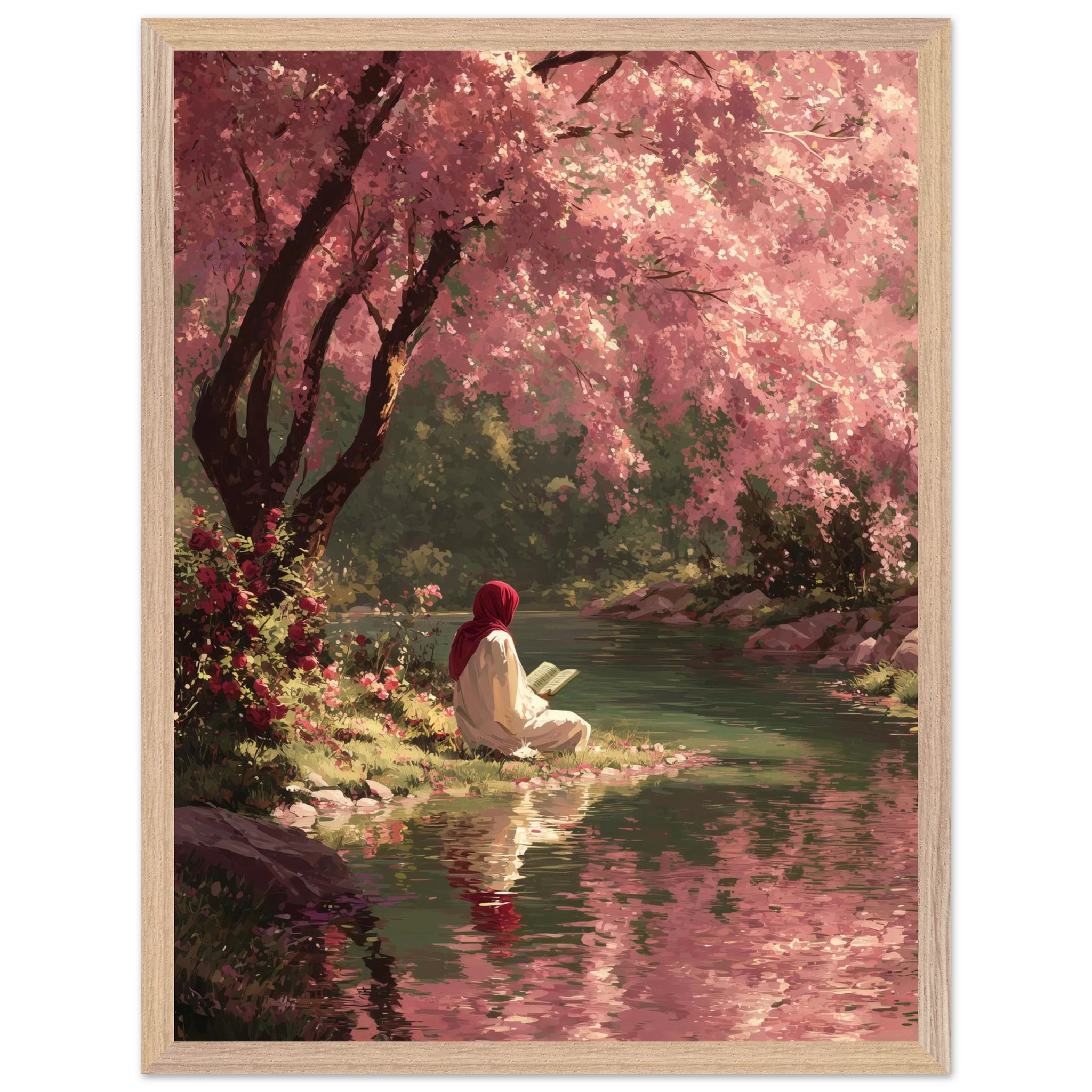 A woman in red hijab reads peacefully beside flowing water under a canopy of pink cherry blossoms. Soft coral and rose tones create gentle spring atmosphere whilst fallen petals carpet the riverbank. The painterly style captures perfect harmony between Islamic devotion and natural beauty.