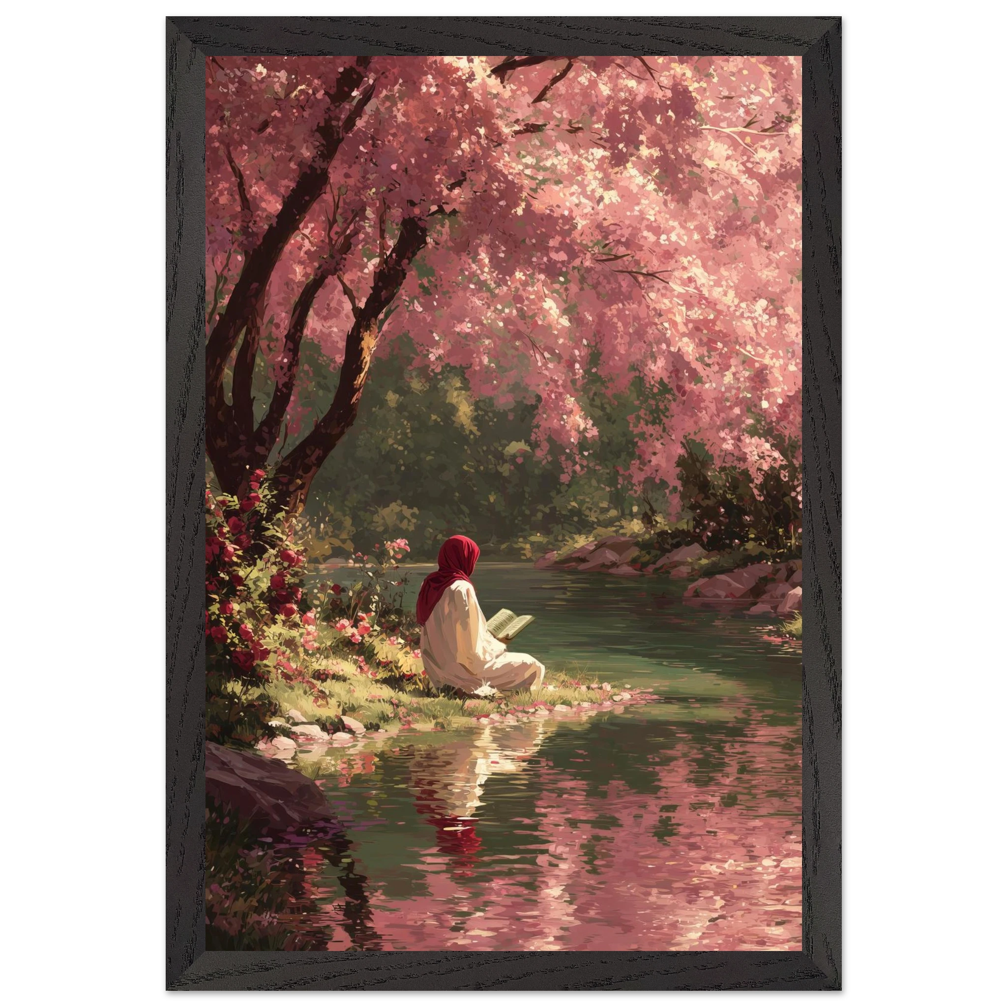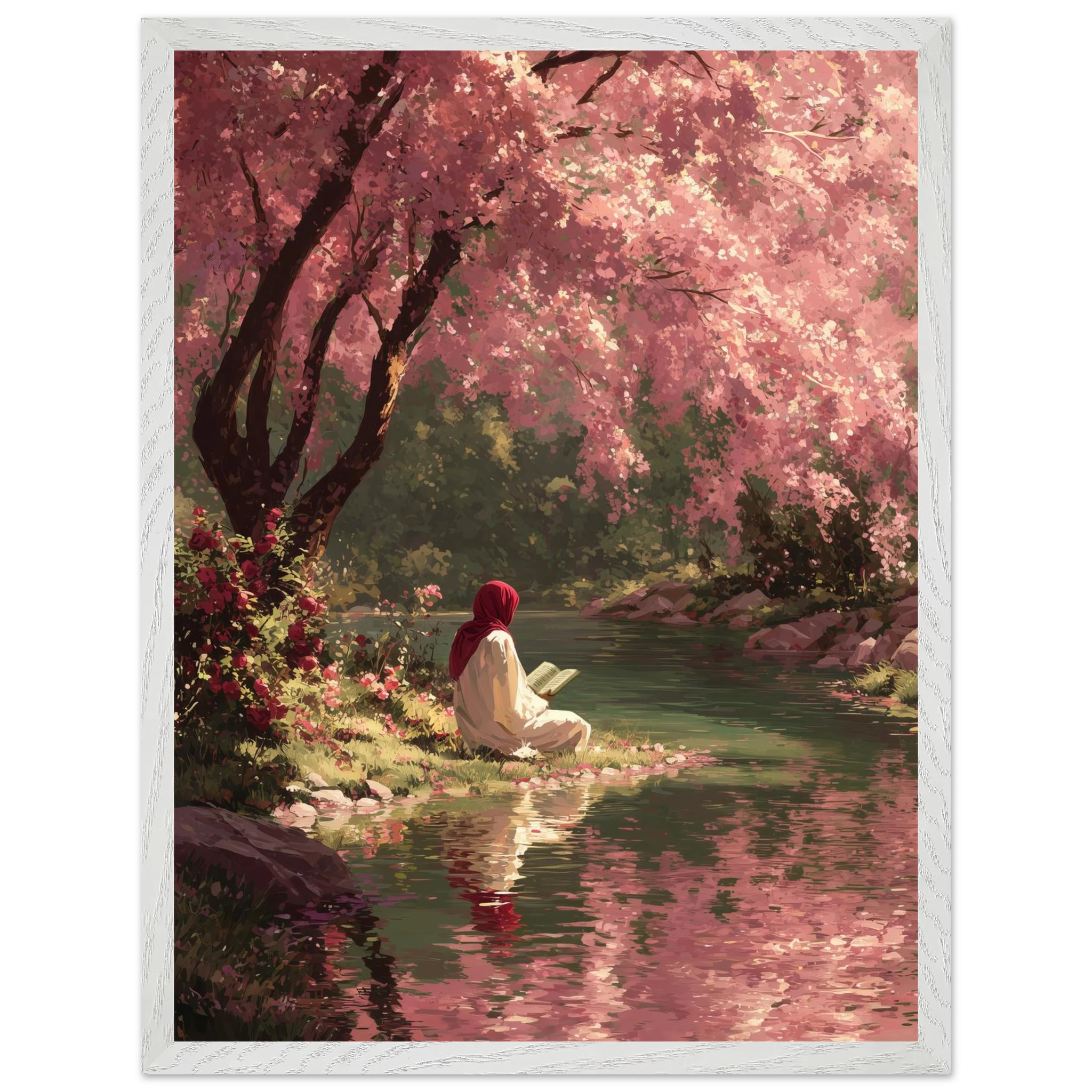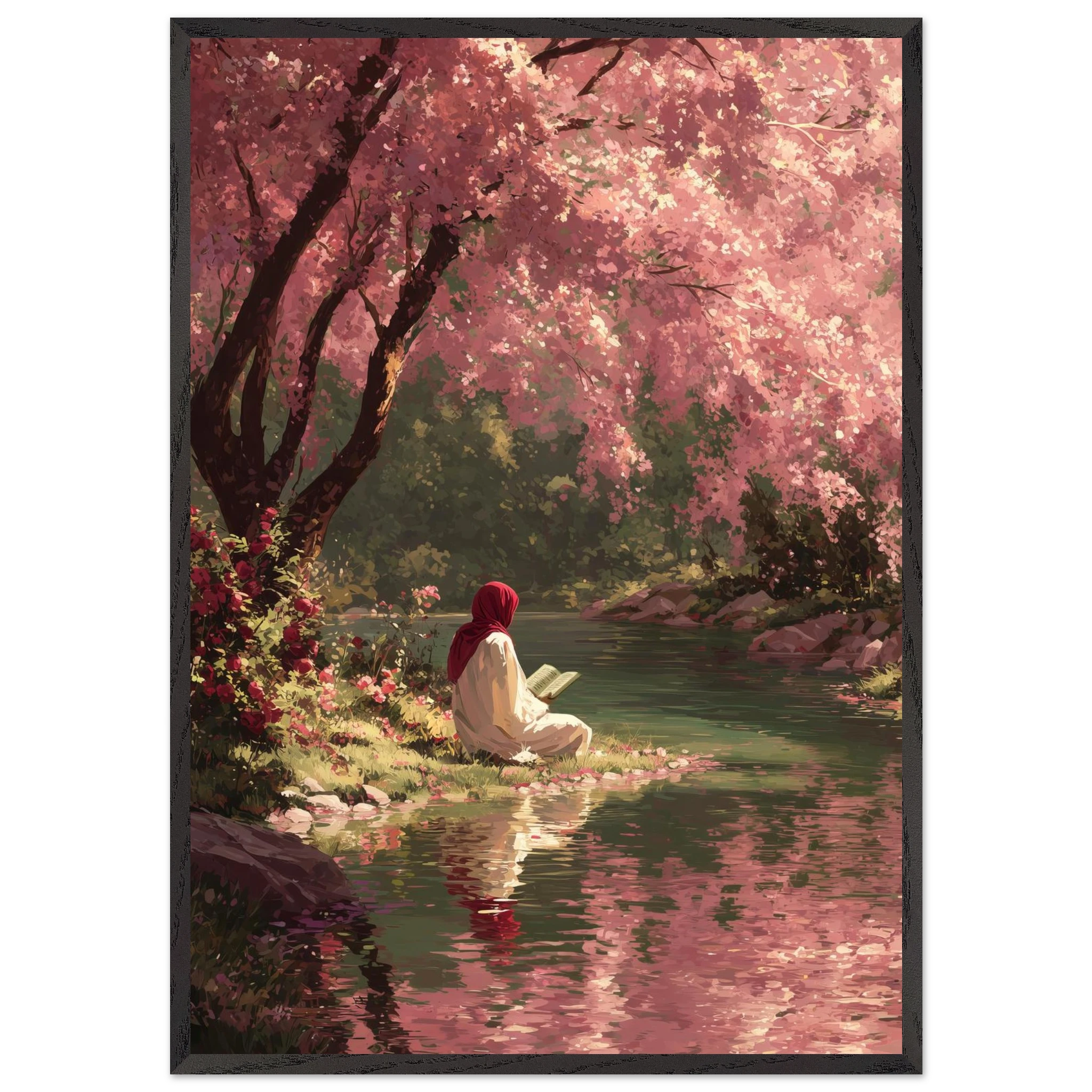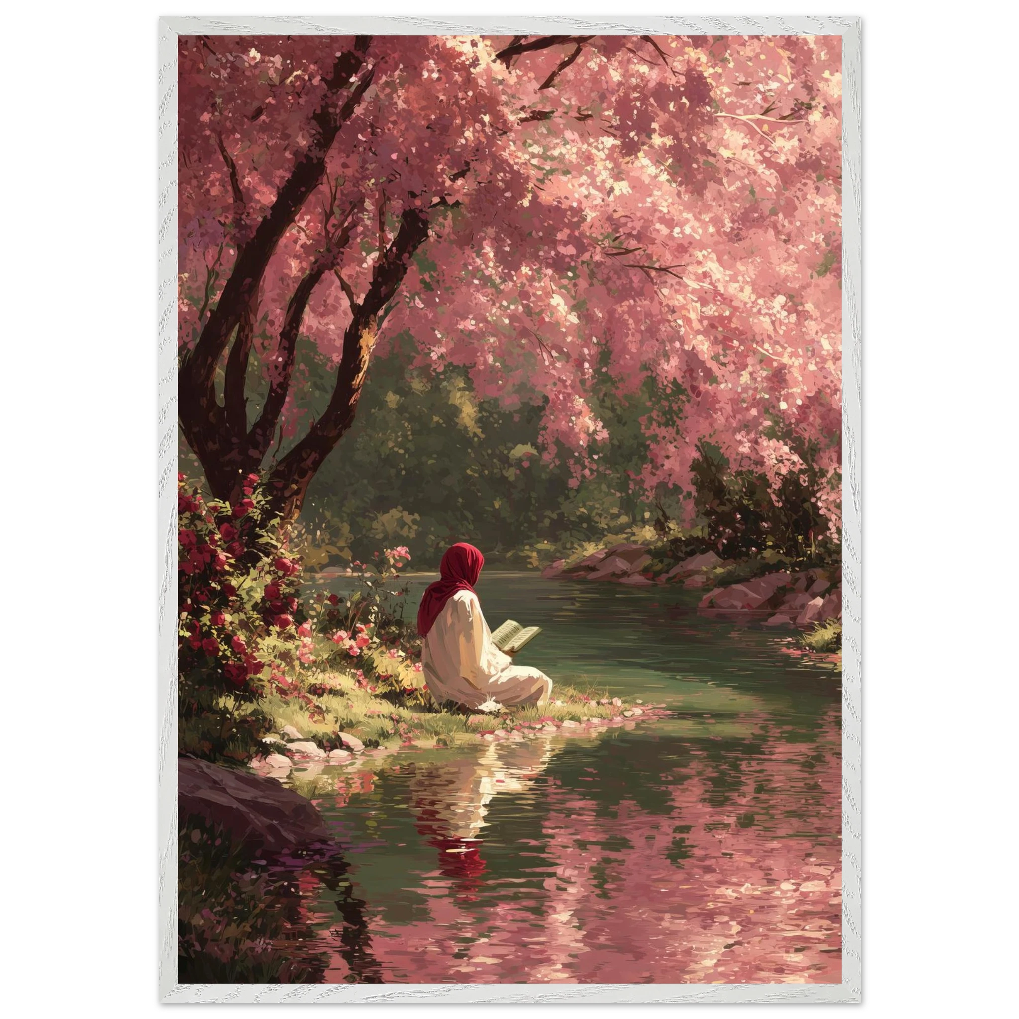 A woman in red hijab reads peacefully beside flowing water under a canopy of pink cherry blossoms. Soft coral and rose tones create gentle spring atmosphere whilst fallen petals carpet the riverbank. The painterly style captures perfect harmony between Islamic devotion and natural beauty.