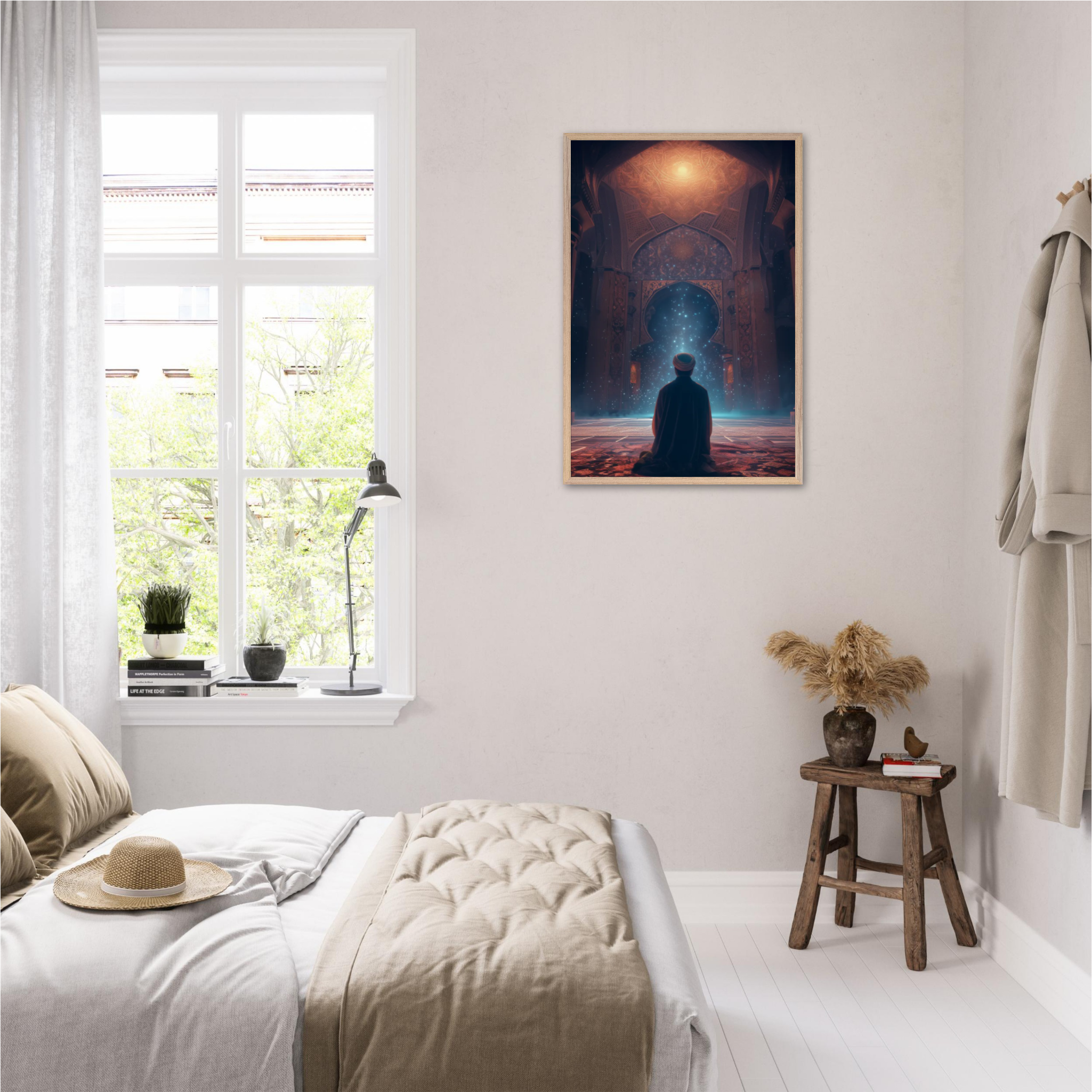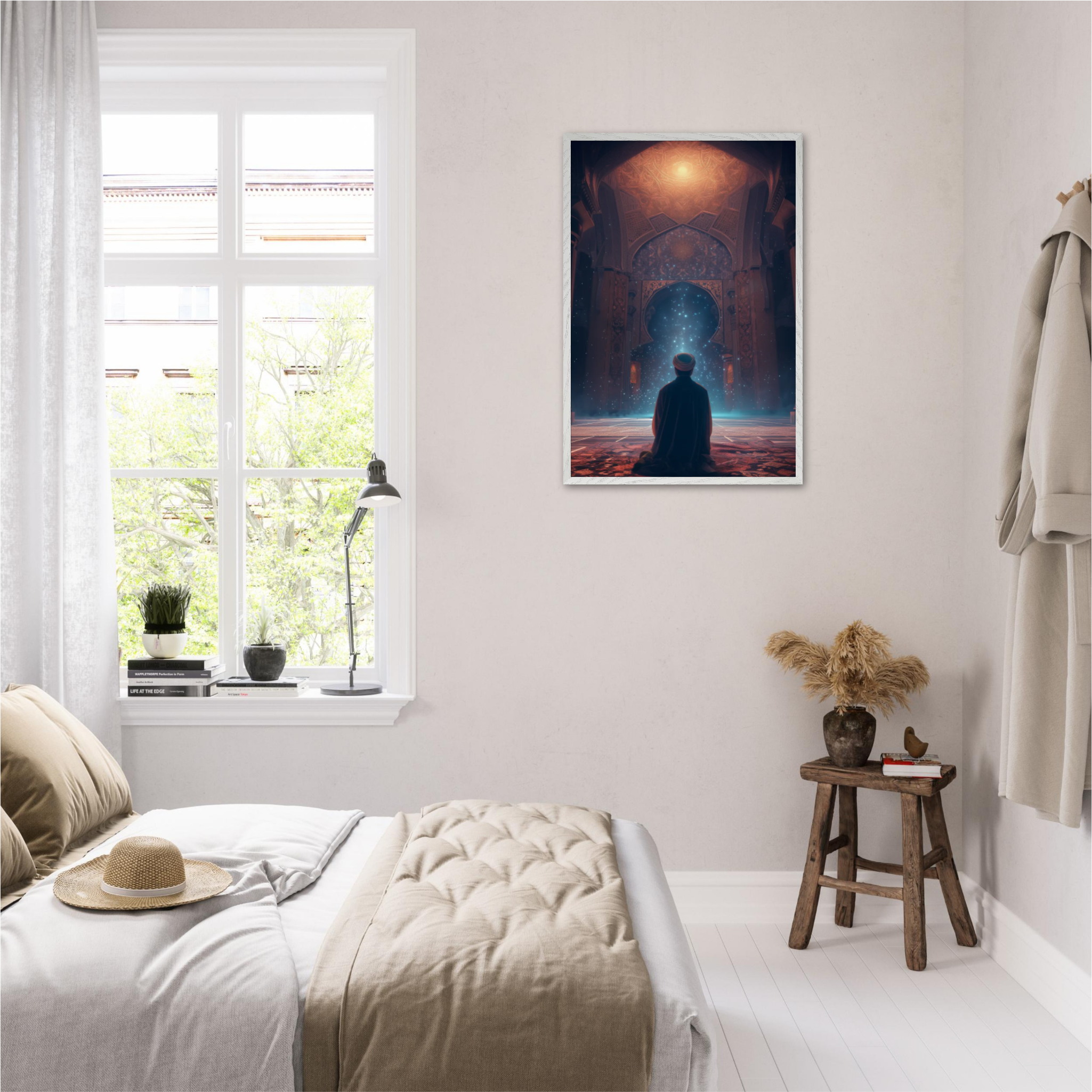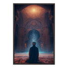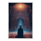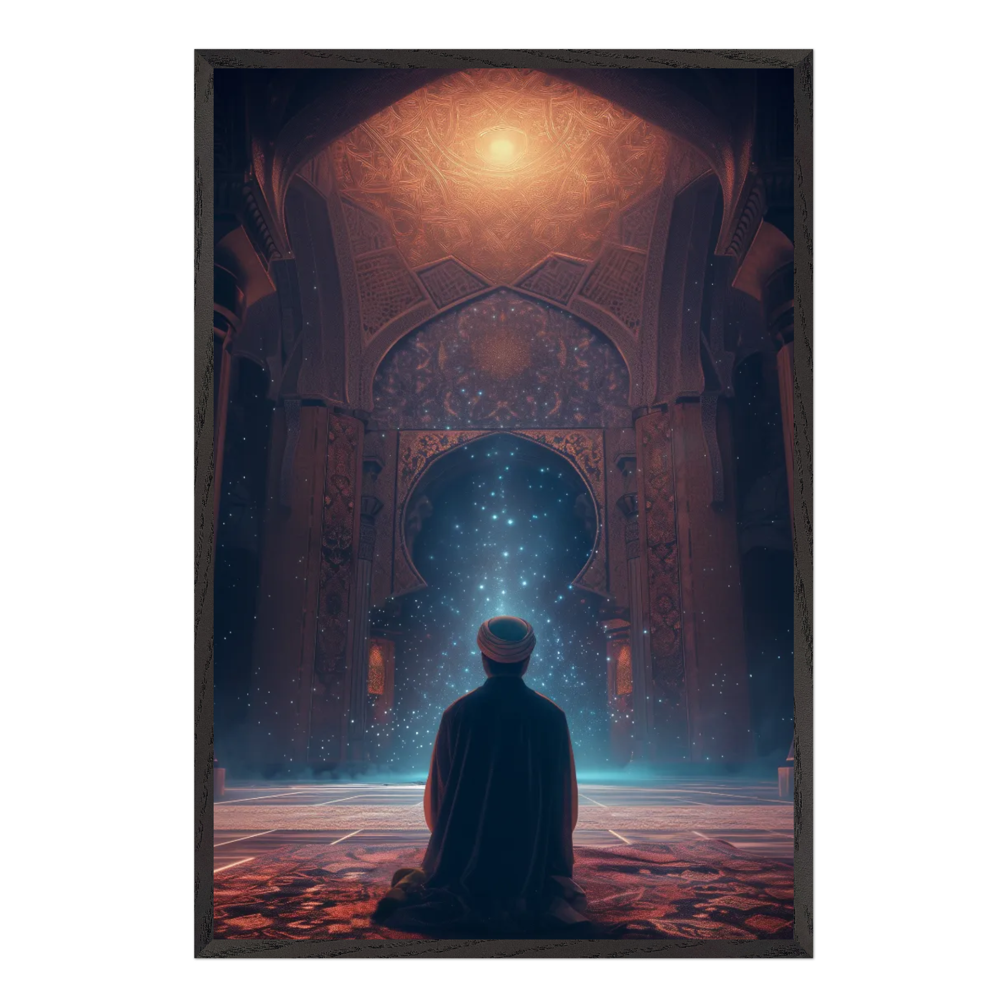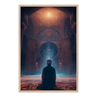 Be inspired by 'Gateway to the Infinite', a breathtaking vision where earthly devotion meets celestial wonder. This magnificent artwork depicts a solitary believer in peaceful contemplation within an ornate mosque whose intricate geometric patterns and soaring archways frame not a ceiling, but the star-filled cosmos itself. Warm golden light emanates from the luminous dome above, whilst cool starlit radiance flows through the cosmic archway, creating a profound interplay between earthly sanctuary and infinite space. The piece beautifully illustrates the Islamic teaching that sincere prayer opens doorways between the temporal and eternal, where the believer's heart touches the very edge of eternity. Perfect for contemporary Muslim homes seeking sophisticated spiritual art, this powerful image serves as a daily reminder that every prayer is a transcendent journey toward the Divine.