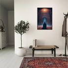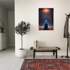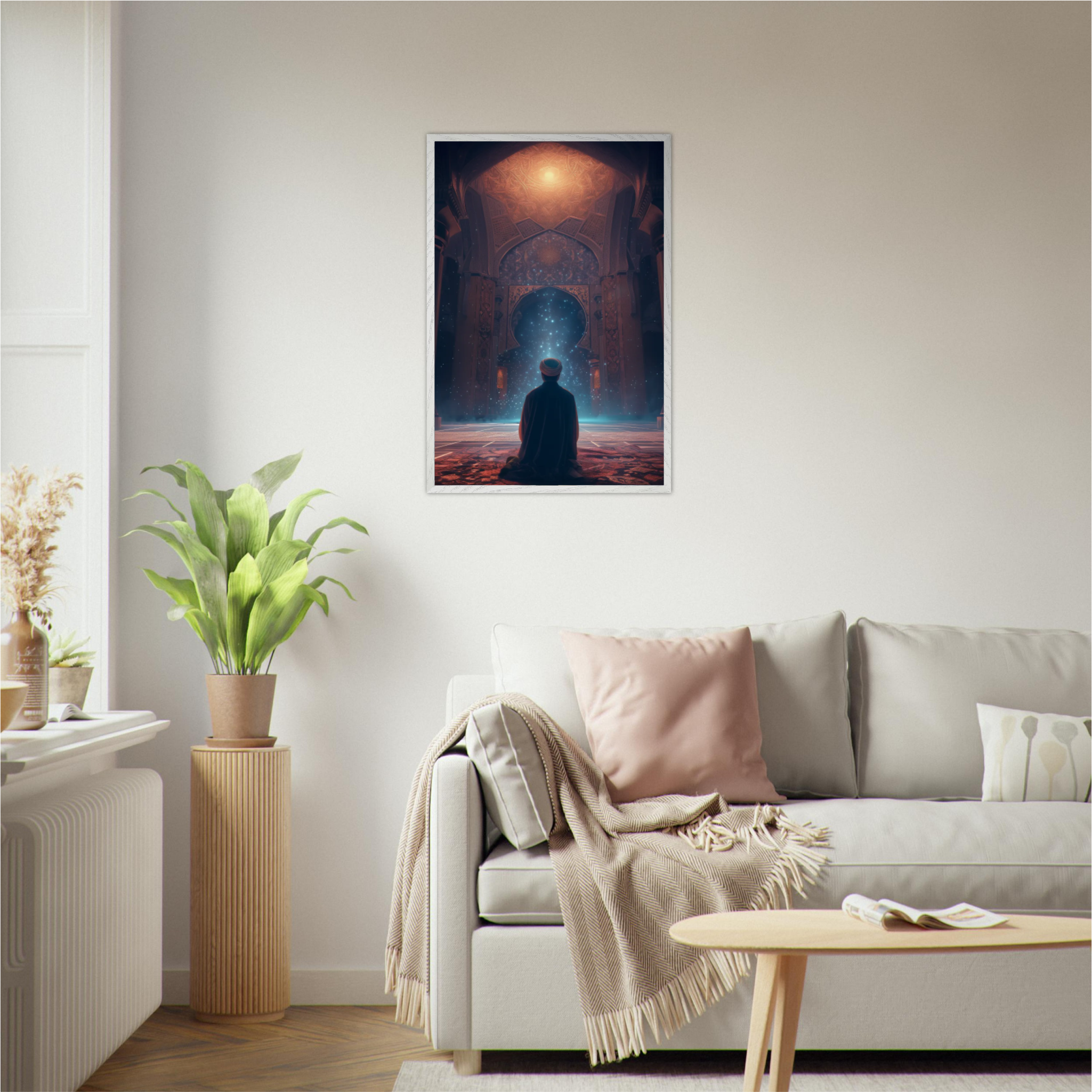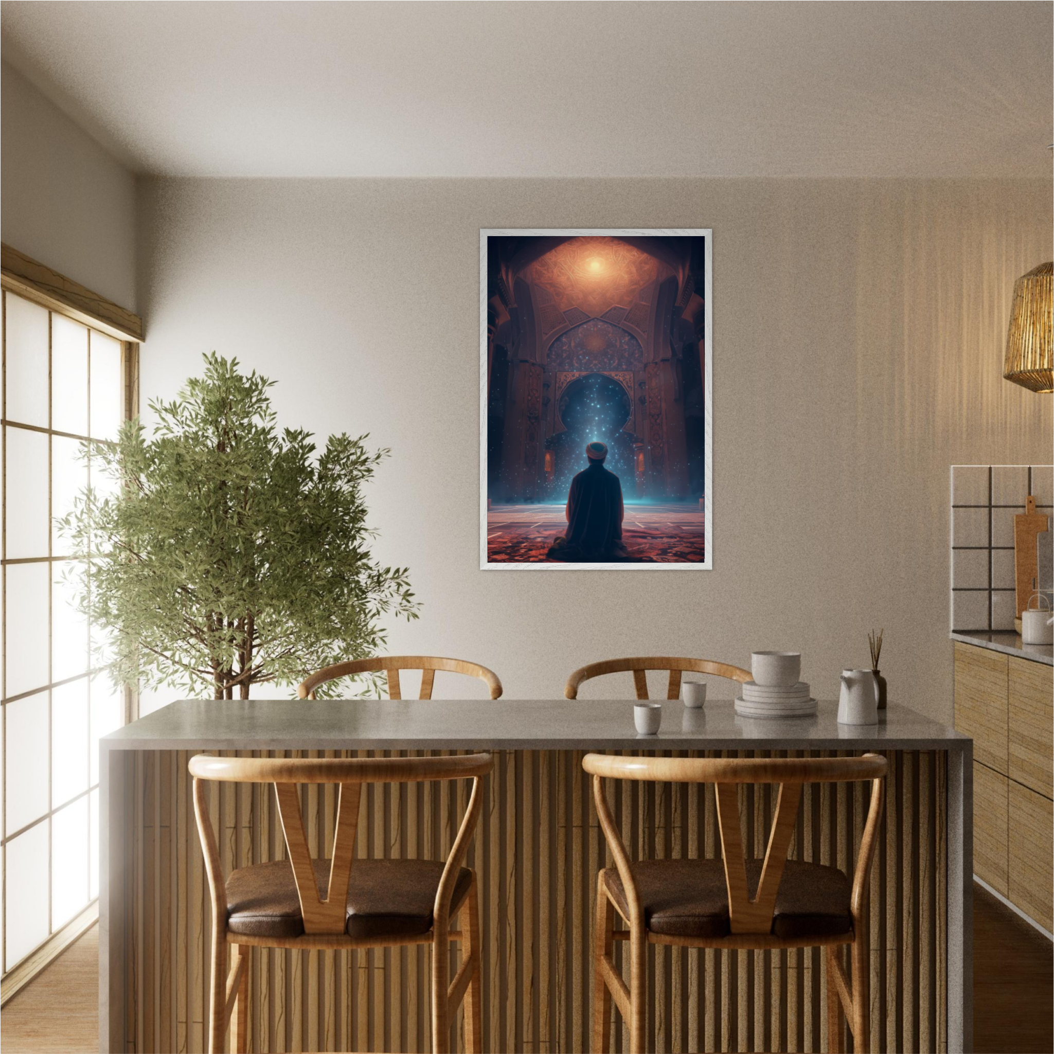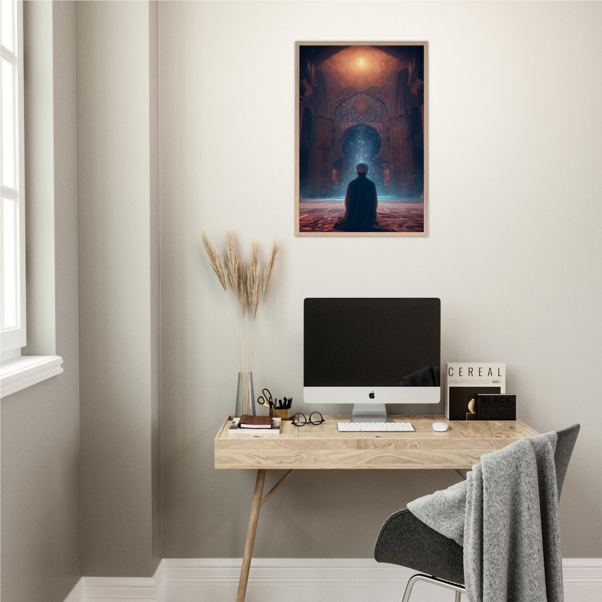 Be inspired by 'Gateway to the Infinite', a breathtaking vision where earthly devotion meets celestial wonder. This magnificent artwork depicts a solitary believer in peaceful contemplation within an ornate mosque whose intricate geometric patterns and soaring archways frame not a ceiling, but the star-filled cosmos itself. Warm golden light emanates from the luminous dome above, whilst cool starlit radiance flows through the cosmic archway, creating a profound interplay between earthly sanctuary and infinite space. The piece beautifully illustrates the Islamic teaching that sincere prayer opens doorways between the temporal and eternal, where the believer's heart touches the very edge of eternity. Perfect for contemporary Muslim homes seeking sophisticated spiritual art, this powerful image serves as a daily reminder that every prayer is a transcendent journey toward the Divine.