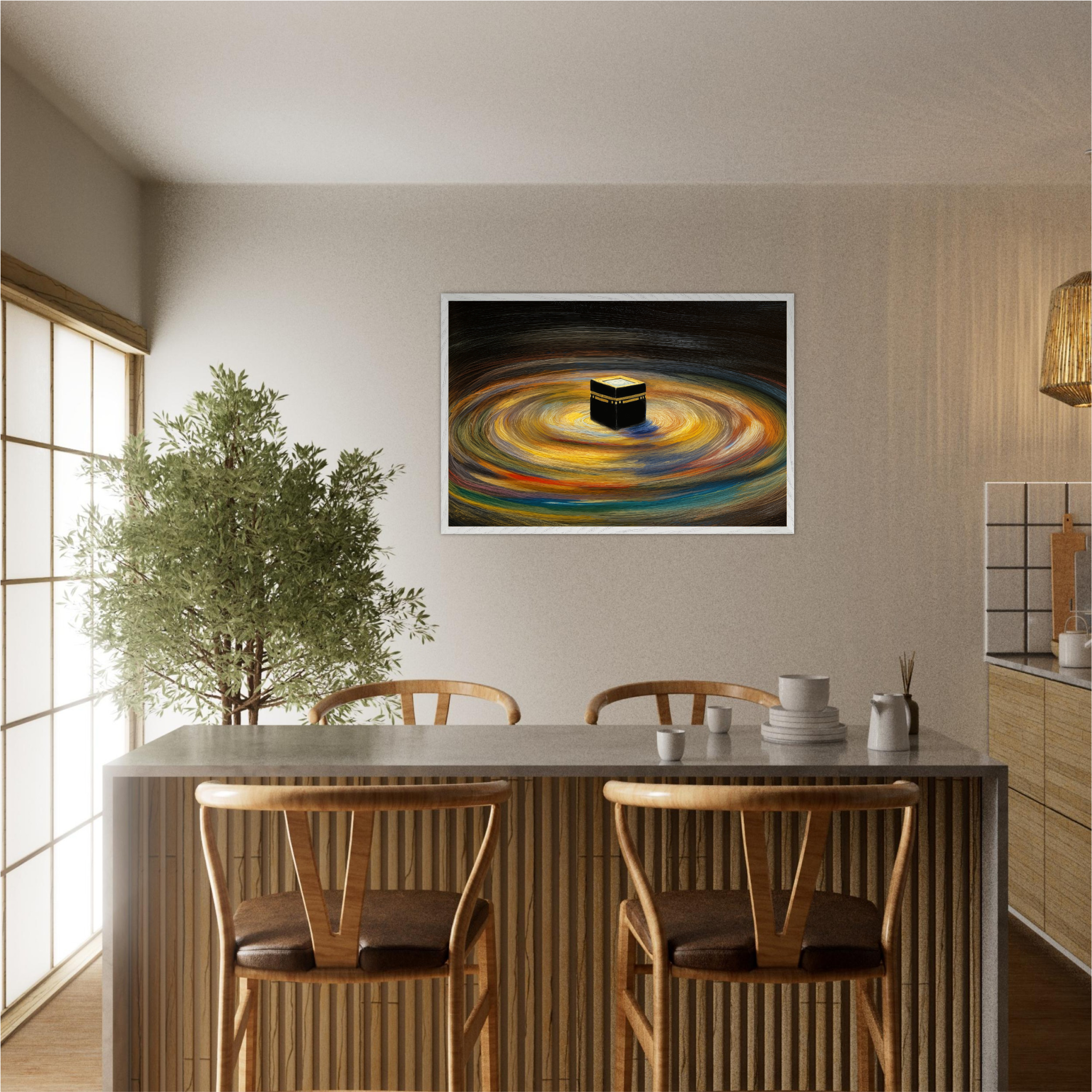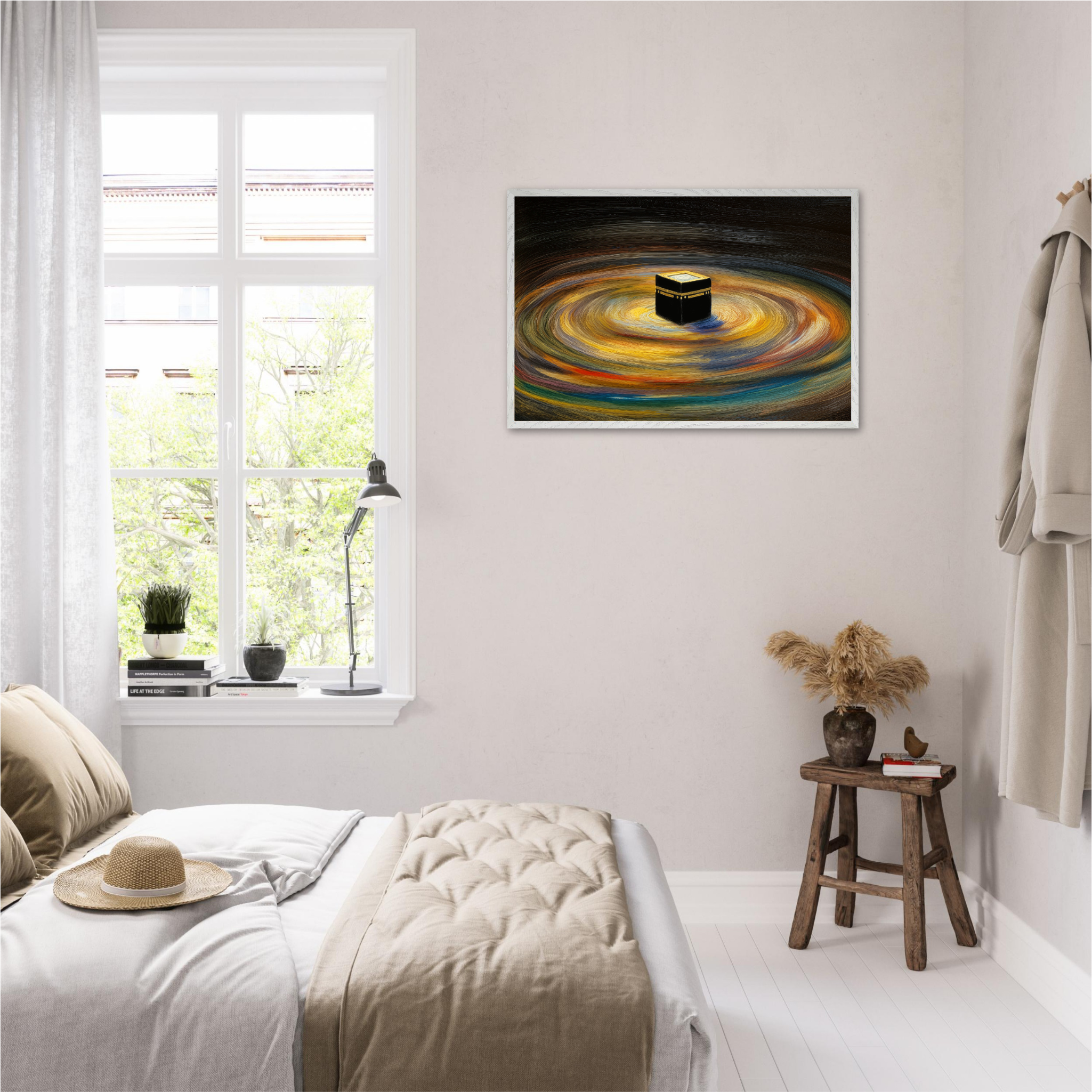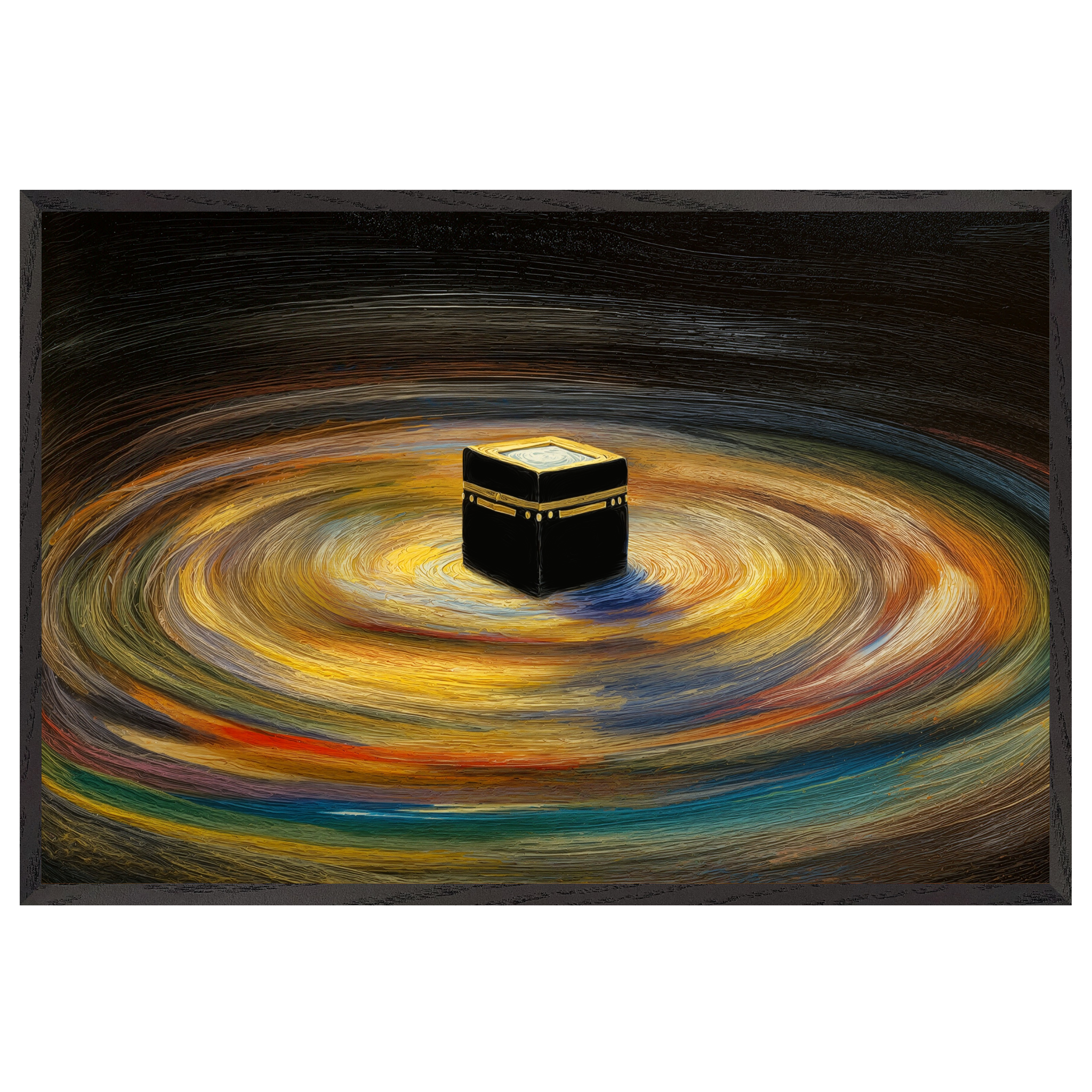 Immerse yourself in 'Eternal Tawaf', a spectacular visualisation of the spiritual magnetism emanating from Islam's most sacred site. This dynamic masterpiece depicts the holy Kaaba surrounded by flowing concentric circles in rich jewel tones, golden amber, deep bronze, and warm sienna, that suggest the eternal movement of tawaf pilgrimage. The swirling motion creates a sense of cosmic energy, representing how the Kaaba serves as the spiritual gravitational center drawing believers from across the globe into unified worship. The painterly brushstrokes add tactile dimension whilst the warm color palette evokes the desert setting and the infinite nature of devotion. Perfect for contemporary Muslim homes seeking powerful statement art that celebrates the unifying force of pilgrimage and the eternal nature of spiritual seeking.