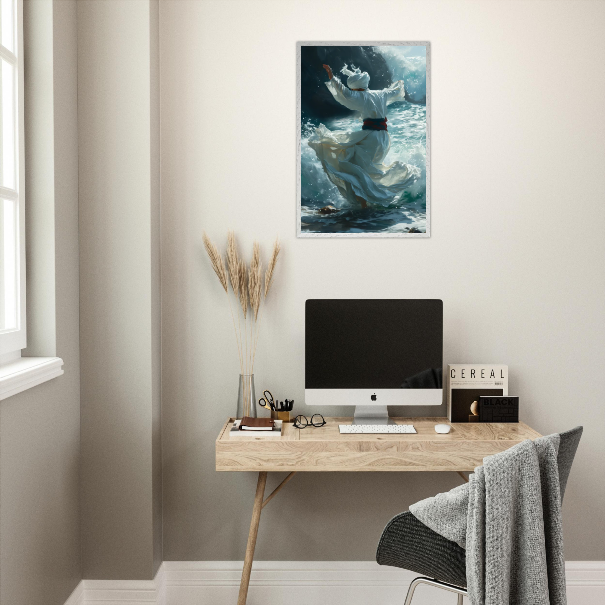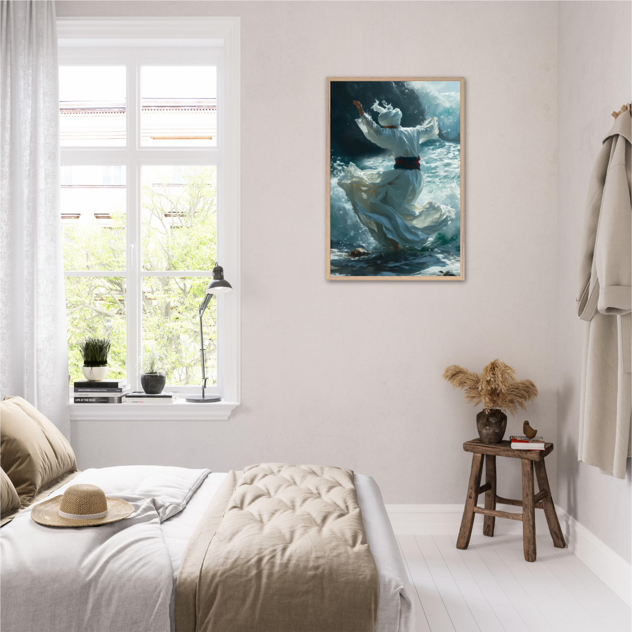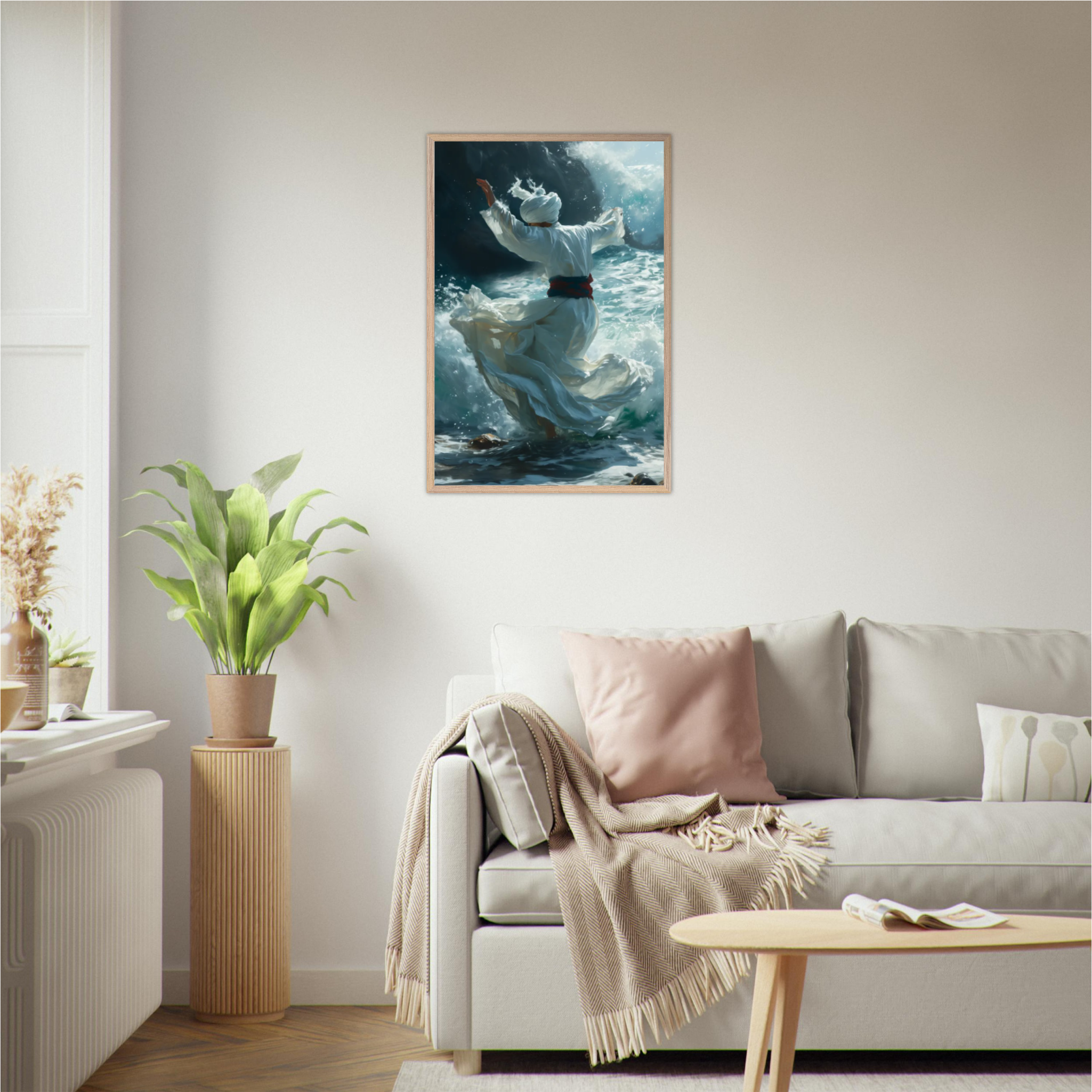 Experience 'Fluid Devotion', a breathtaking fusion of Sufi mysticism and aquatic serenity. This extraordinary piece depicts a whirling dervish suspended in translucent blue-green waters, their white robes flowing like liquid prayer around their spinning form. The underwater setting transforms traditional whirling into otherworldly meditation, where the dervish moves through liquid light rather than air. Bubbles and currents create natural mandalas, suggesting how mystical practice generates ripples of spiritual energy throughout creation. The aquatic environment symbolises divine love's fluid nature and the soul's desire to merge with the Beloved. Perfect for contemporary Muslim homes seeking sophisticated spiritual art, this unique interpretation celebrates how Sufi wisdom flows through all creation's elements.