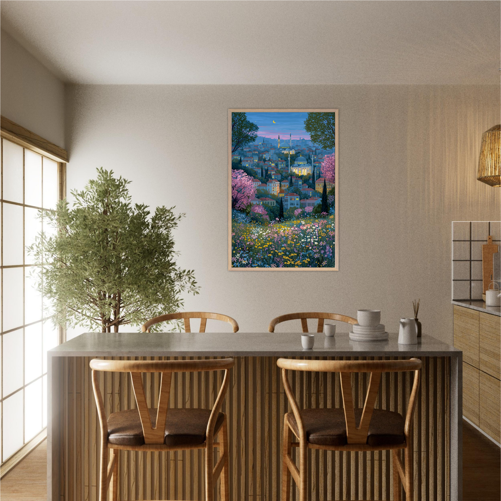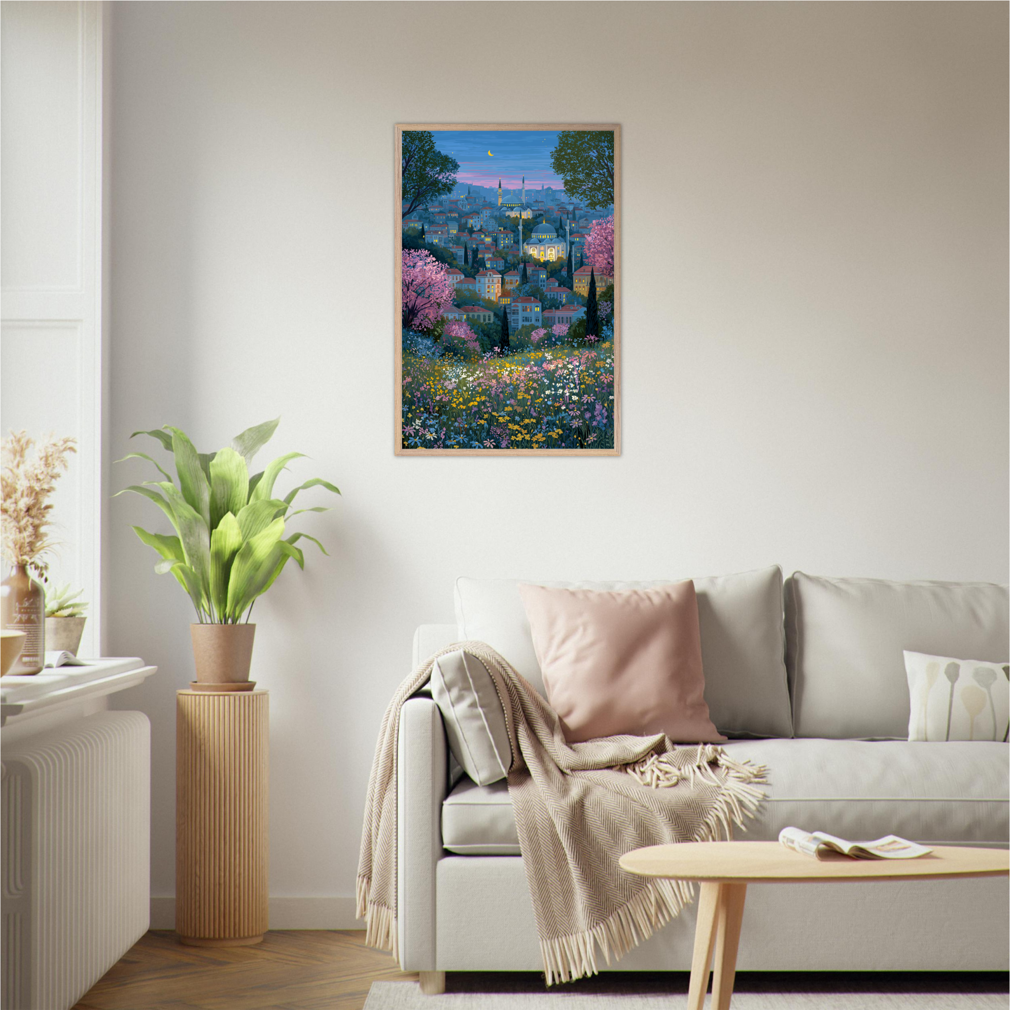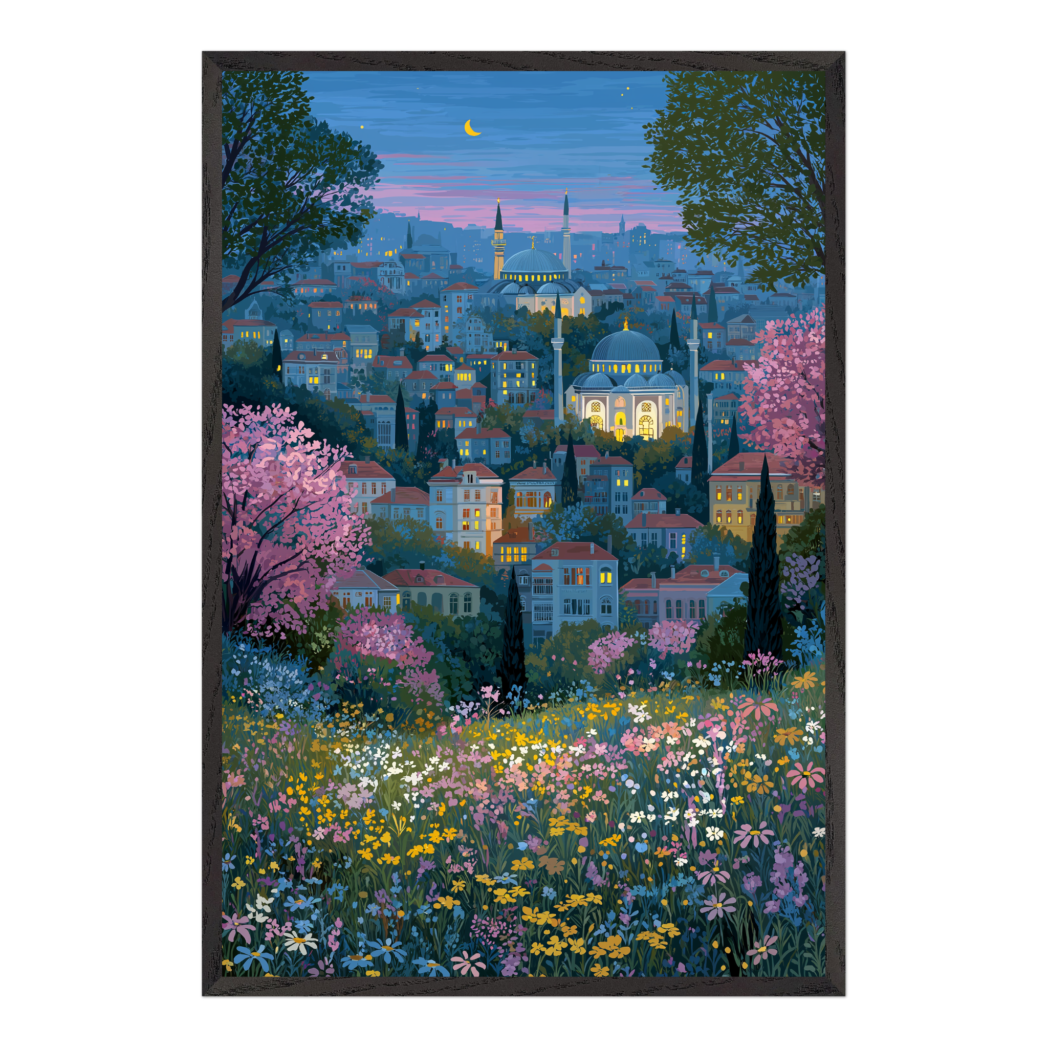 Discover 'Ottoman Twlight', a breathtaking portrayal of Istanbul's timeless spiritual beauty at its most enchanting hour. This masterful artwork depicts the city's iconic Ottoman mosques with their distinctive domes and minarets rising gracefully above a tapestry of warm terracotta rooftops and glowing windows. Vibrant spring wildflowers and delicate cherry blossoms create a natural frame in pink and golden hues, echoing the twilight sky where a crescent moon appears amongst soft clouds. The scene captures that magical moment when the evening call to prayer begins, transforming the bustling cityscape into a sanctuary of spiritual reflection. Perfect for contemporary Muslim homes seeking sophisticated wall art that celebrates the harmonious blend of Islamic architectural heritage, natural splendour, and the sacred rhythms of daily worship