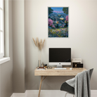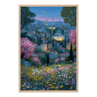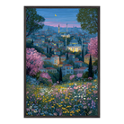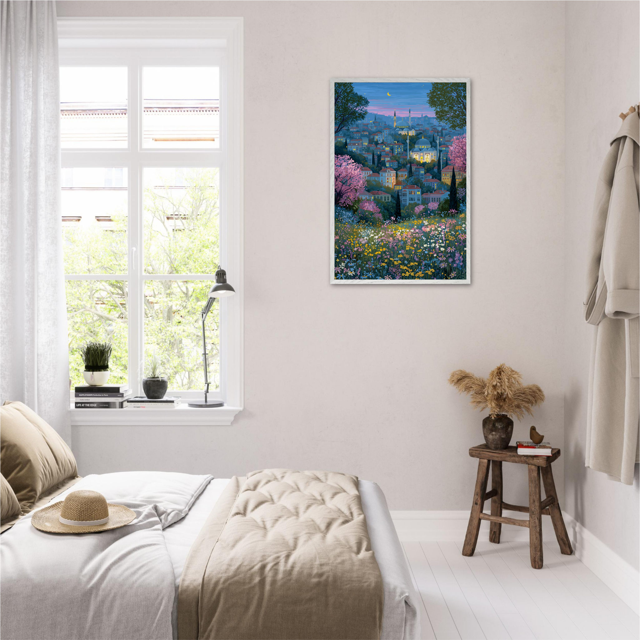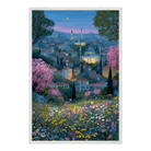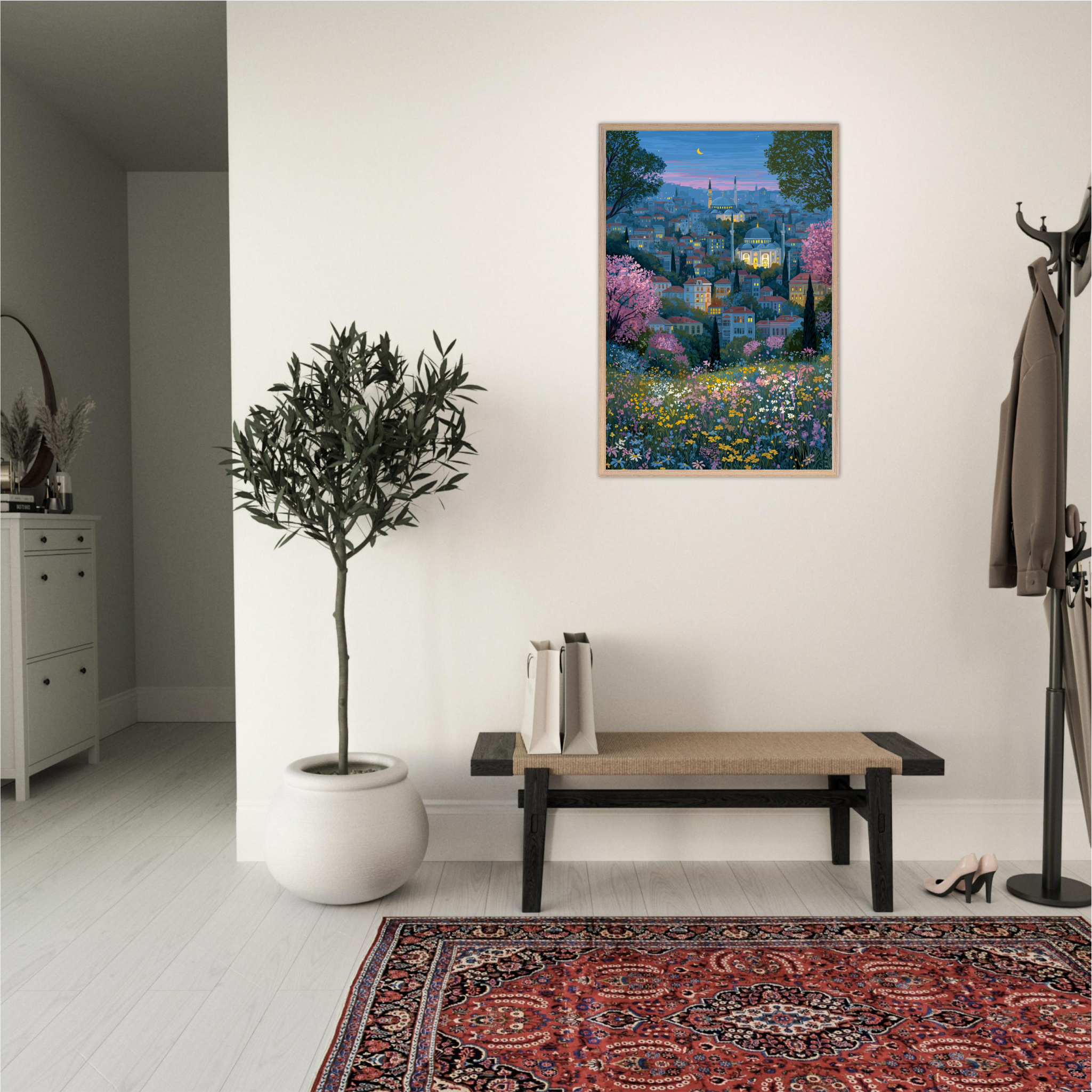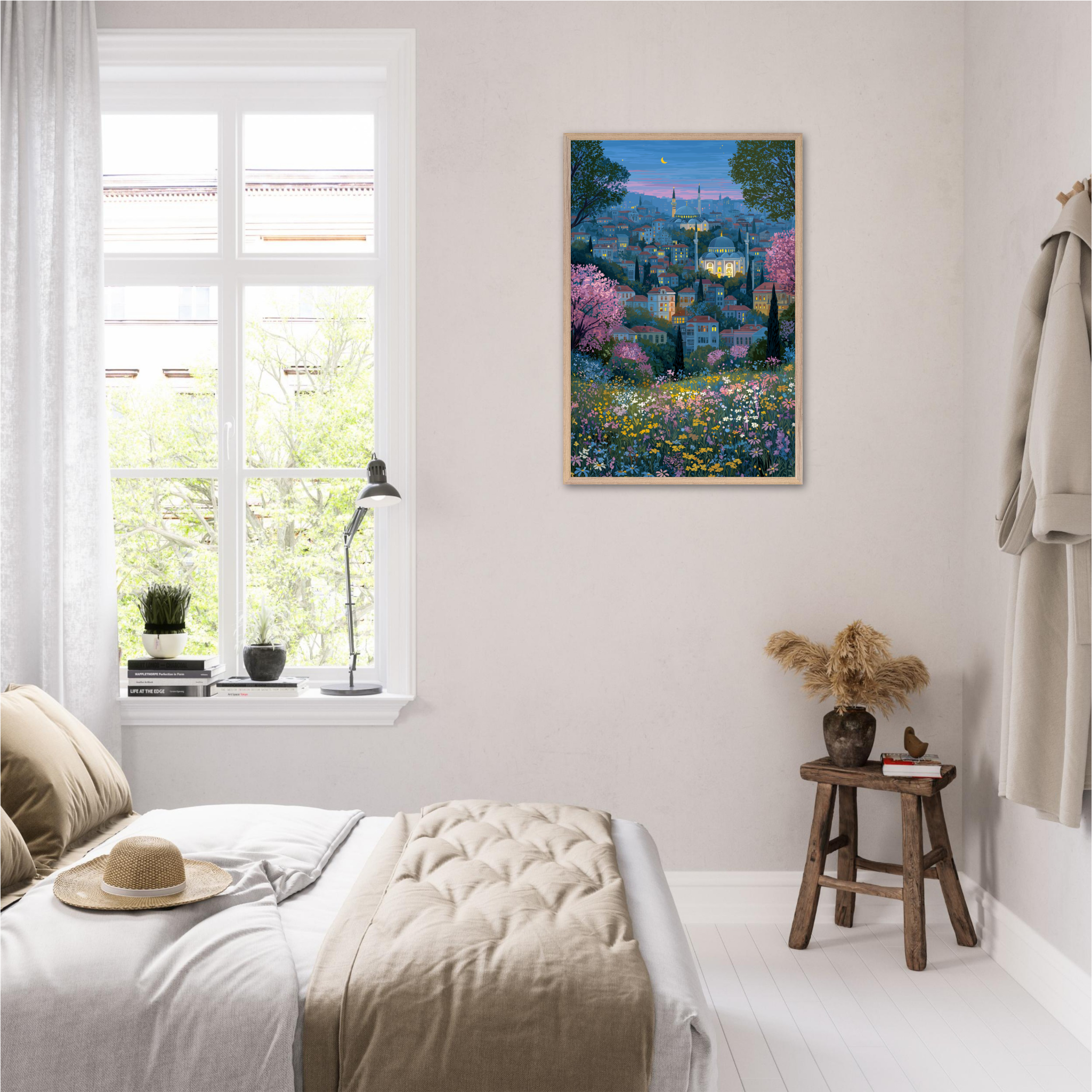 Discover 'Ottoman Twlight', a breathtaking portrayal of Istanbul's timeless spiritual beauty at its most enchanting hour. This masterful artwork depicts the city's iconic Ottoman mosques with their distinctive domes and minarets rising gracefully above a tapestry of warm terracotta rooftops and glowing windows. Vibrant spring wildflowers and delicate cherry blossoms create a natural frame in pink and golden hues, echoing the twilight sky where a crescent moon appears amongst soft clouds. The scene captures that magical moment when the evening call to prayer begins, transforming the bustling cityscape into a sanctuary of spiritual reflection. Perfect for contemporary Muslim homes seeking sophisticated wall art that celebrates the harmonious blend of Islamic architectural heritage, natural splendour, and the sacred rhythms of daily worship
