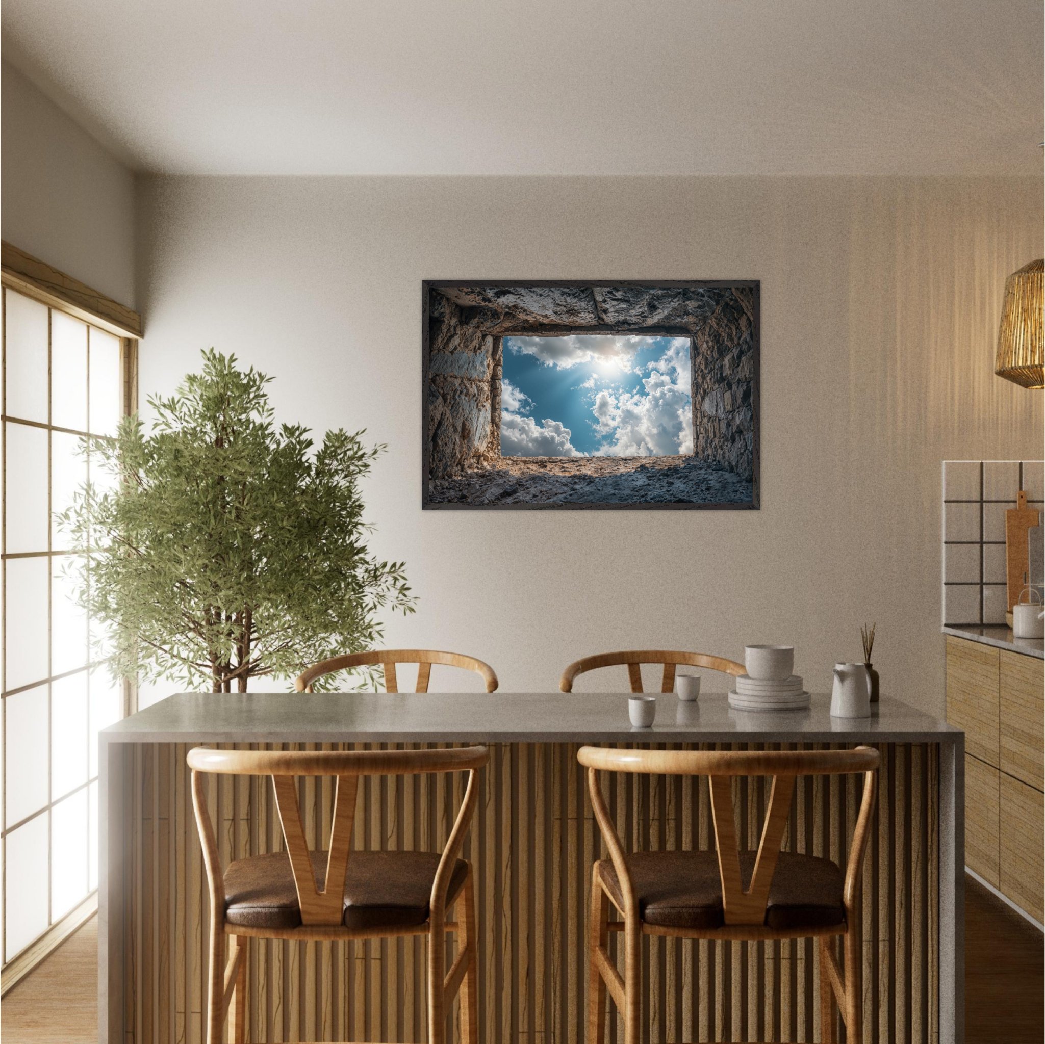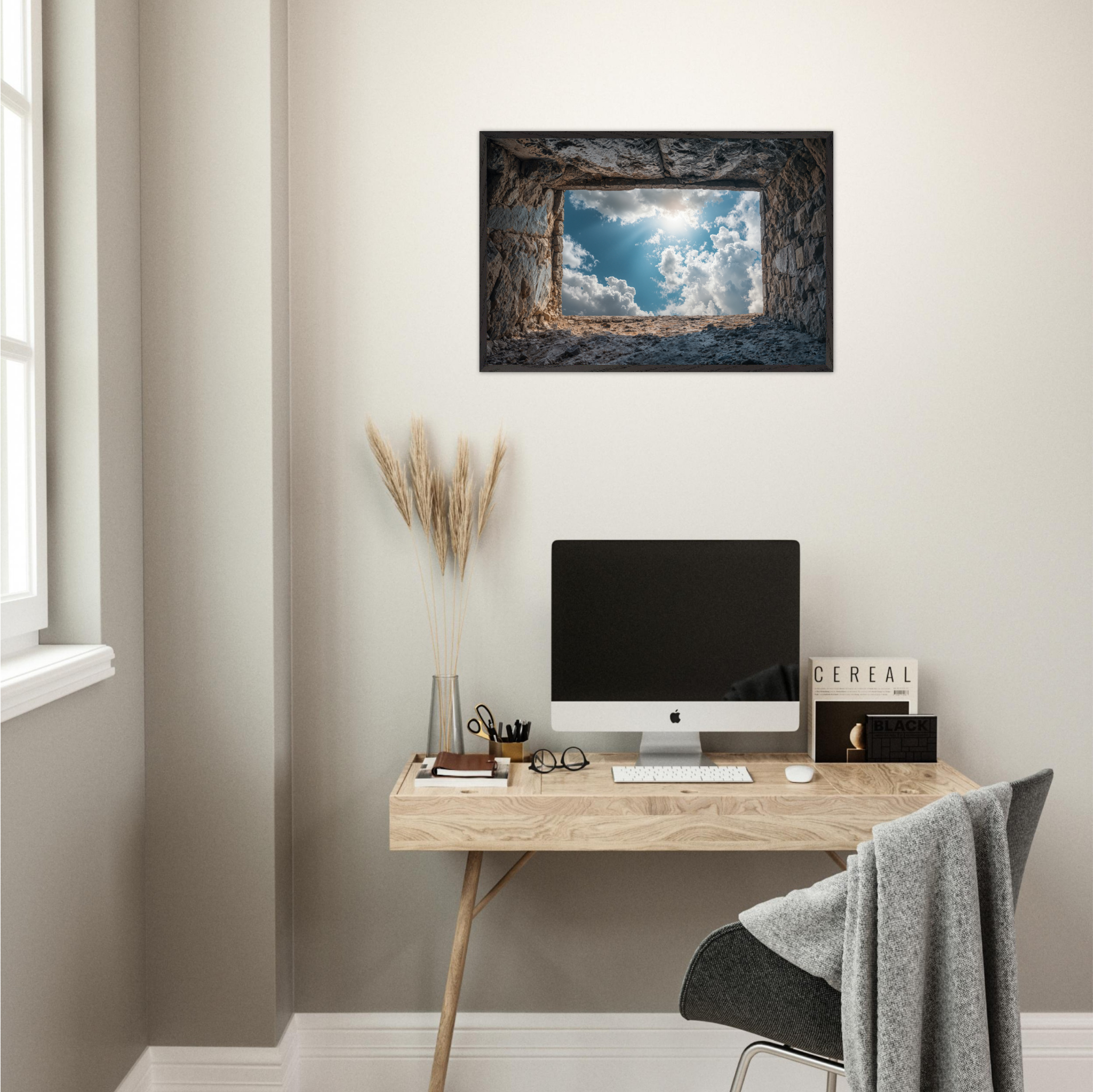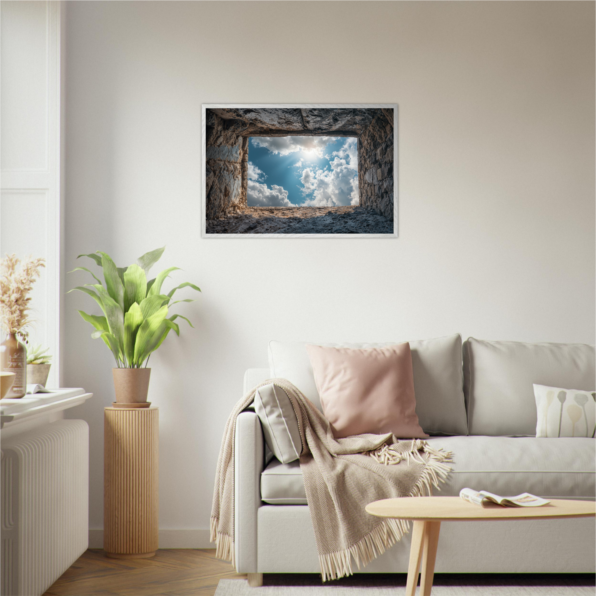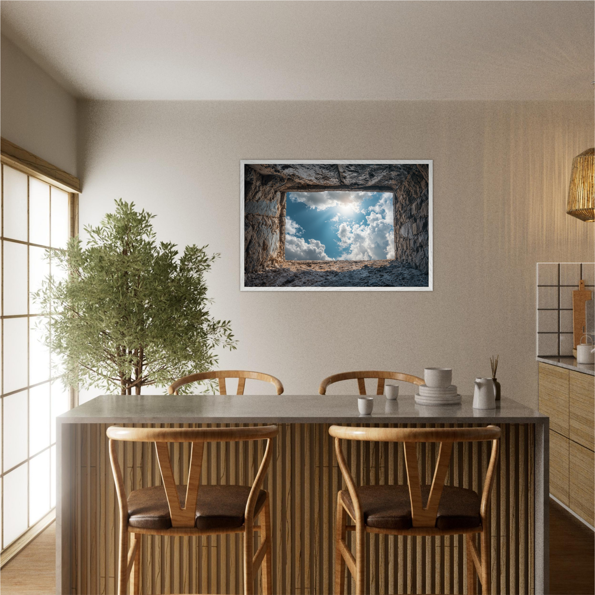 ‘Room with a View’ is a deeply contemplative artwork that captures the Islamic understanding of life's temporary nature and eternal consequences. This striking piece depicts a weathered grave opening onto boundless sky filled with luminous clouds and divine light, symbolizing the transition from earthly existence to the hereafter. The soil walls represent the inevitable conclusion of our worldly concerns, whilst the infinite sky beyond suggests the eternal realm that awaits every soul. The composition invites viewers to contemplate the Quranic teachings about accountability, the Day of Judgment, and the importance of preparing for the afterlife through righteous deeds. Perfect for Muslim homes seeking art that encourages daily reflection on life's deeper purpose and the eternal perspective that should guide all earthly actions.