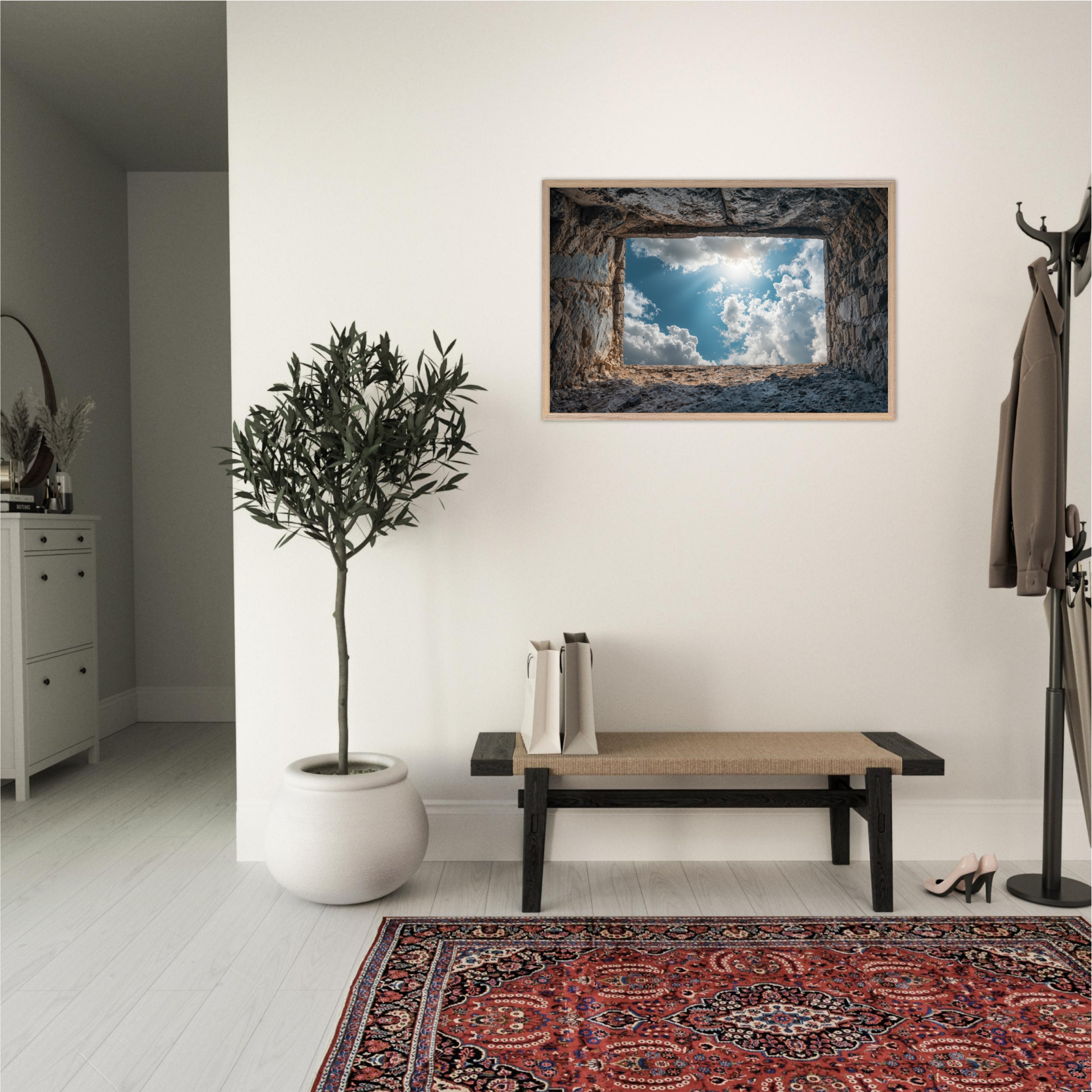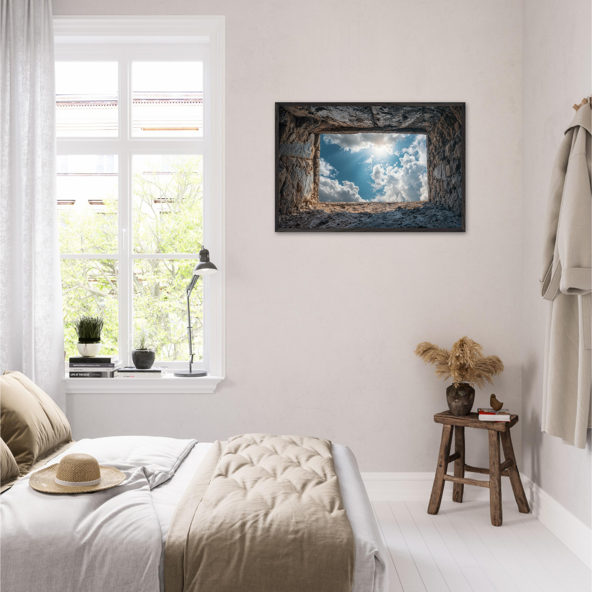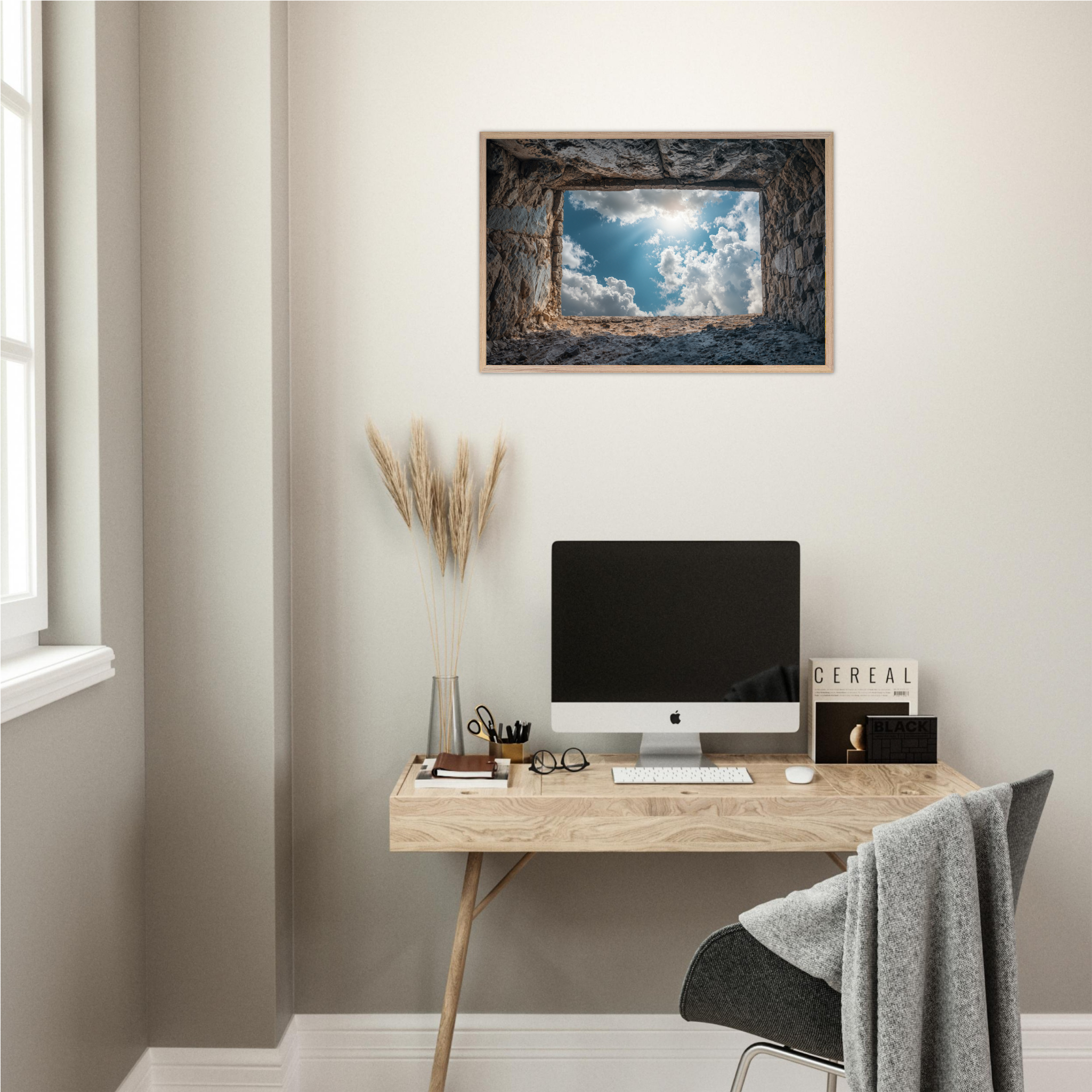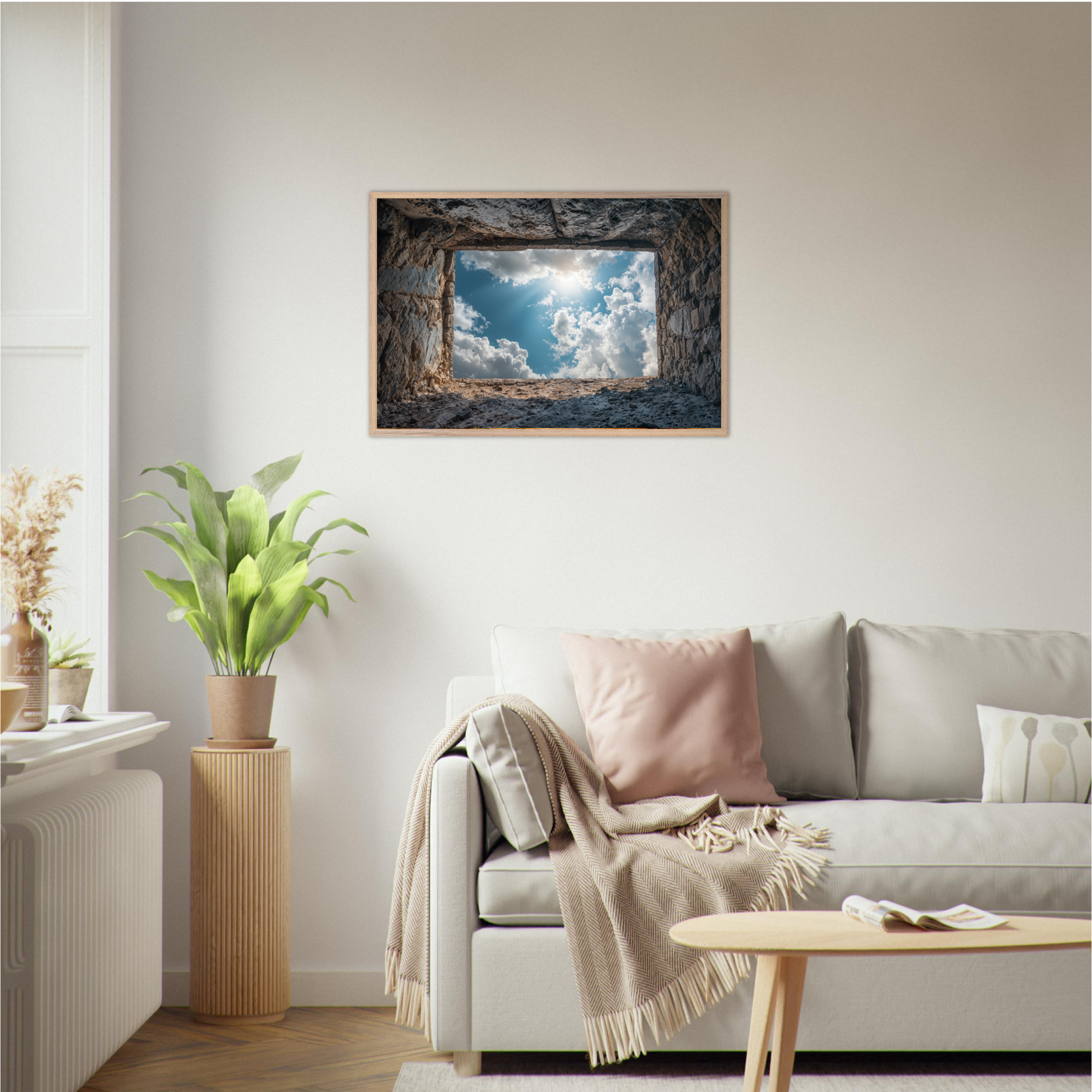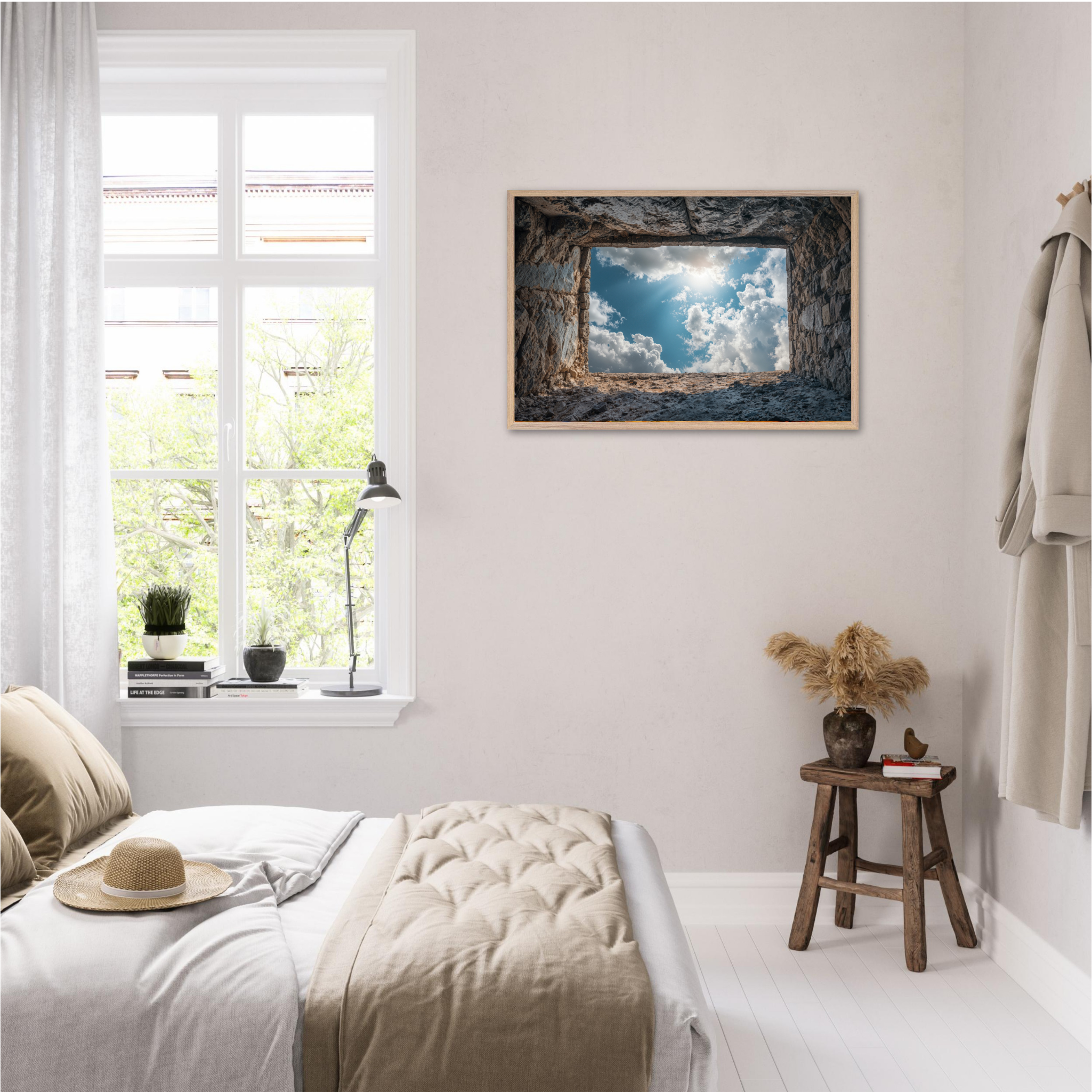‘Room with a View’ is a deeply contemplative artwork that captures the Islamic understanding of life's temporary nature and eternal consequences. This striking piece depicts a weathered grave opening onto boundless sky filled with luminous clouds and divine light, symbolizing the transition from earthly existence to the hereafter. The soil walls represent the inevitable conclusion of our worldly concerns, whilst the infinite sky beyond suggests the eternal realm that awaits every soul. The composition invites viewers to contemplate the Quranic teachings about accountability, the Day of Judgment, and the importance of preparing for the afterlife through righteous deeds. Perfect for Muslim homes seeking art that encourages daily reflection on life's deeper purpose and the eternal perspective that should guide all earthly actions.