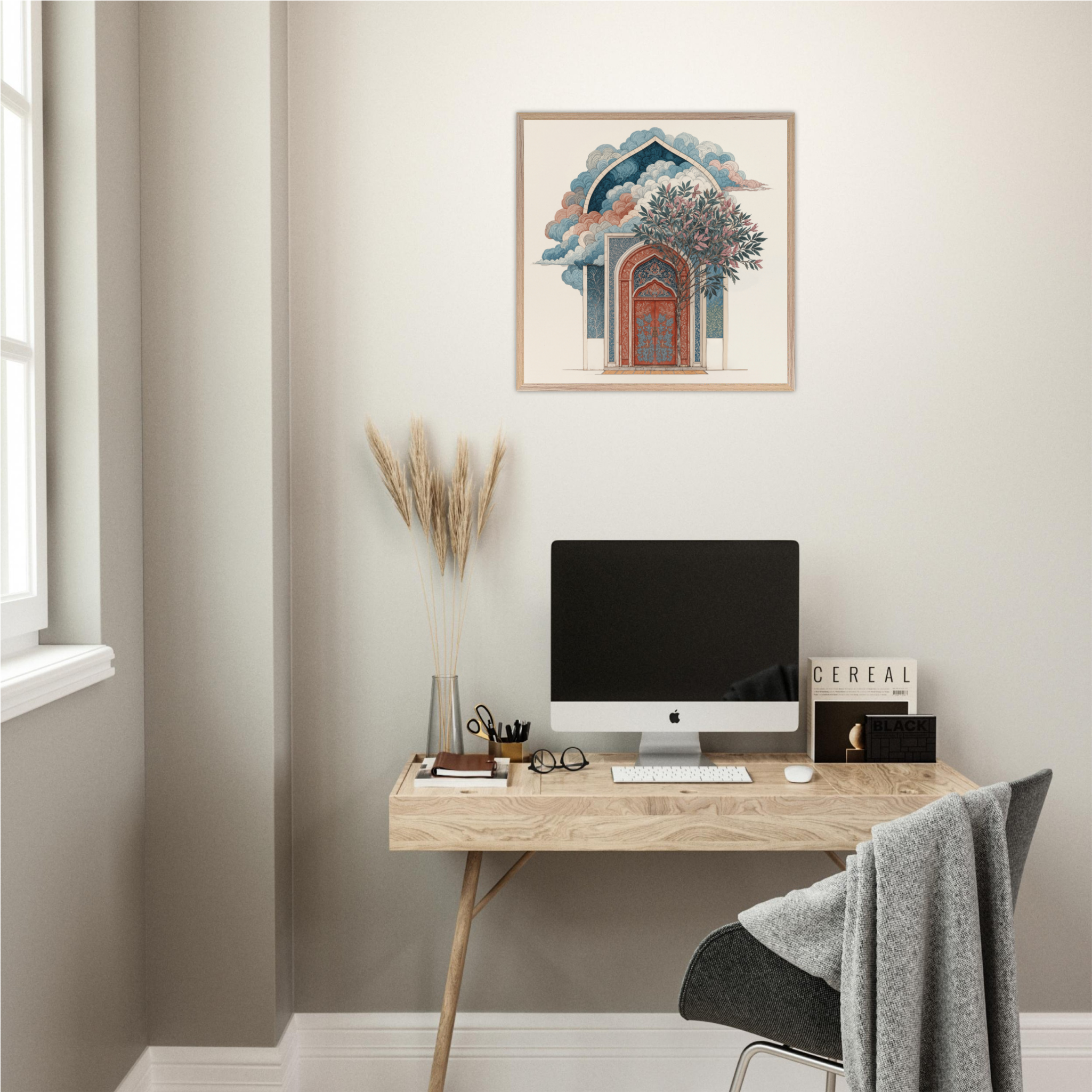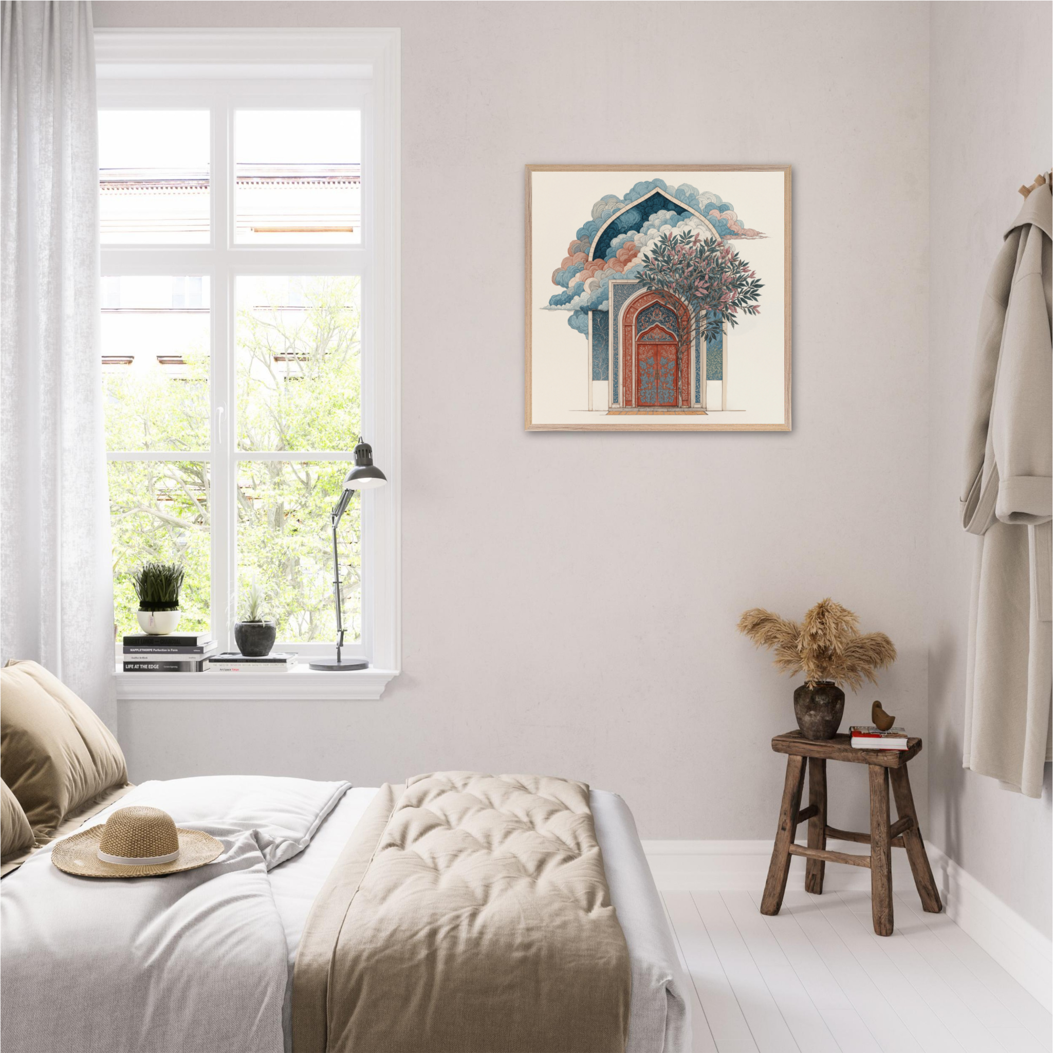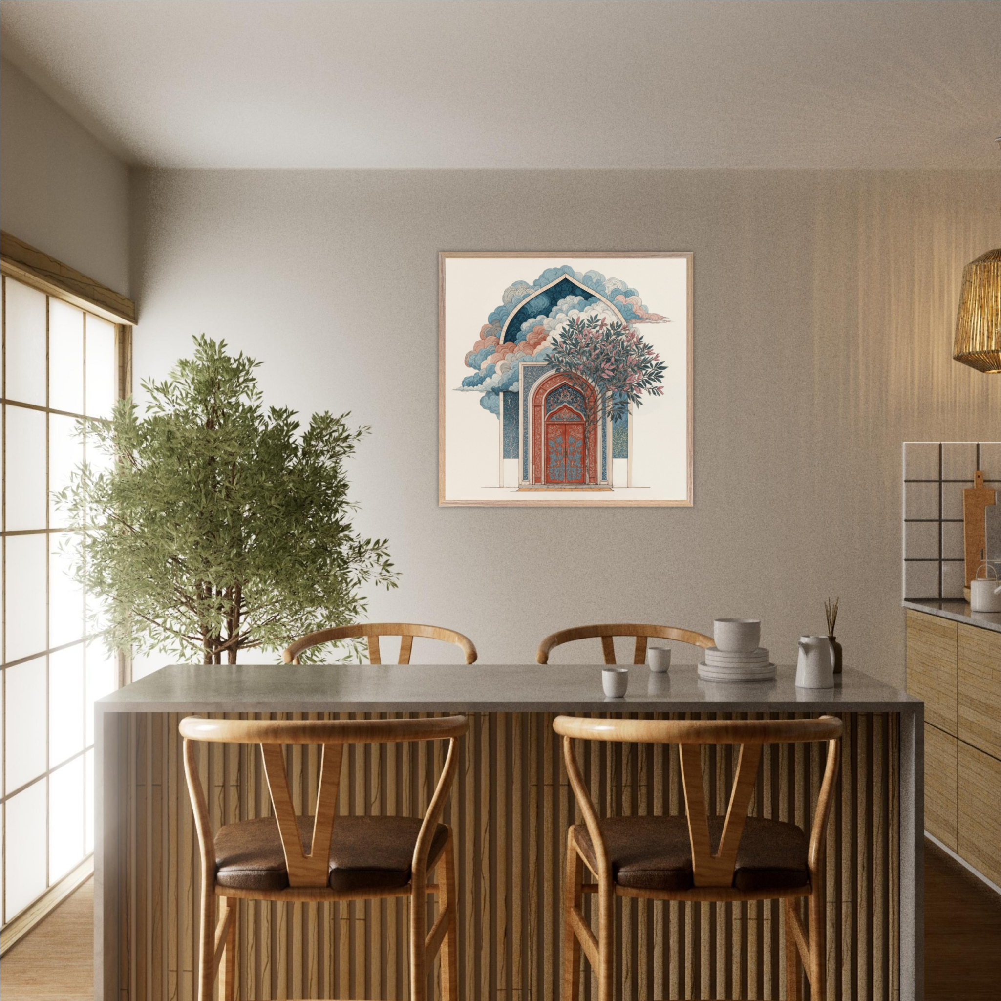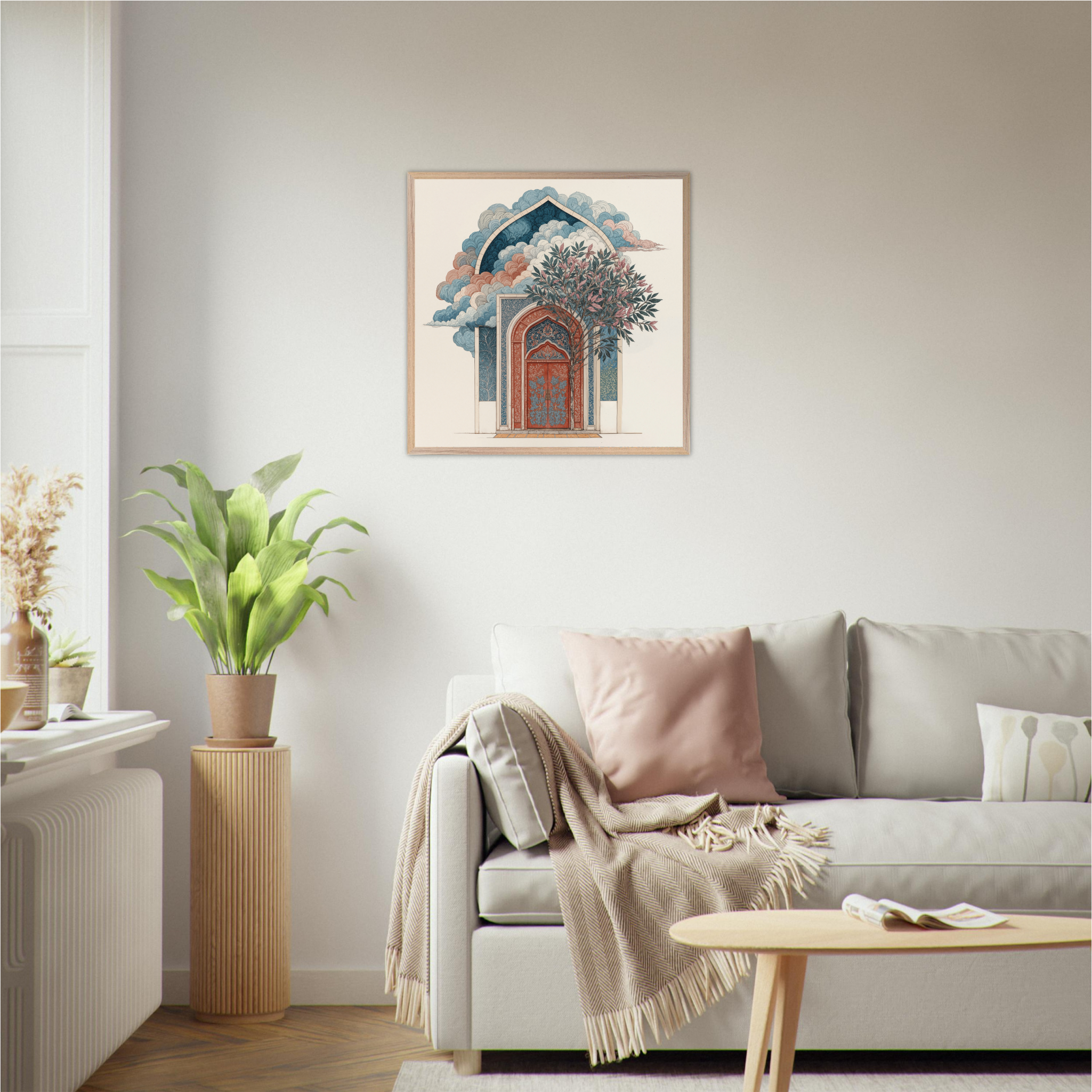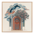 Discover 'Sacred Sanctuary Gateway', a stunning reflection of Islamic architectural magnificence that bridges earthly craftsmanship with celestial wonder. This exquisite piece features intricate geometric patterns adorning a majestic archway in coral and deep blue tones, whilst billowing clouds create an otherworldly atmosphere above. The flourishing tree symbolises spiritual growth nurtured within sacred spaces, whilst the detailed arabesque patterns demonstrate the mathematical precision inherent in Islamic design. The composition beautifully captures how traditional architecture serves as more than mere shelter, it becomes a portal for spiritual elevation and divine connection. Perfect for sophisticated Muslim homes seeking wall art that honors architectural heritage whilst inspiring daily contemplation of beauty's role in faith.