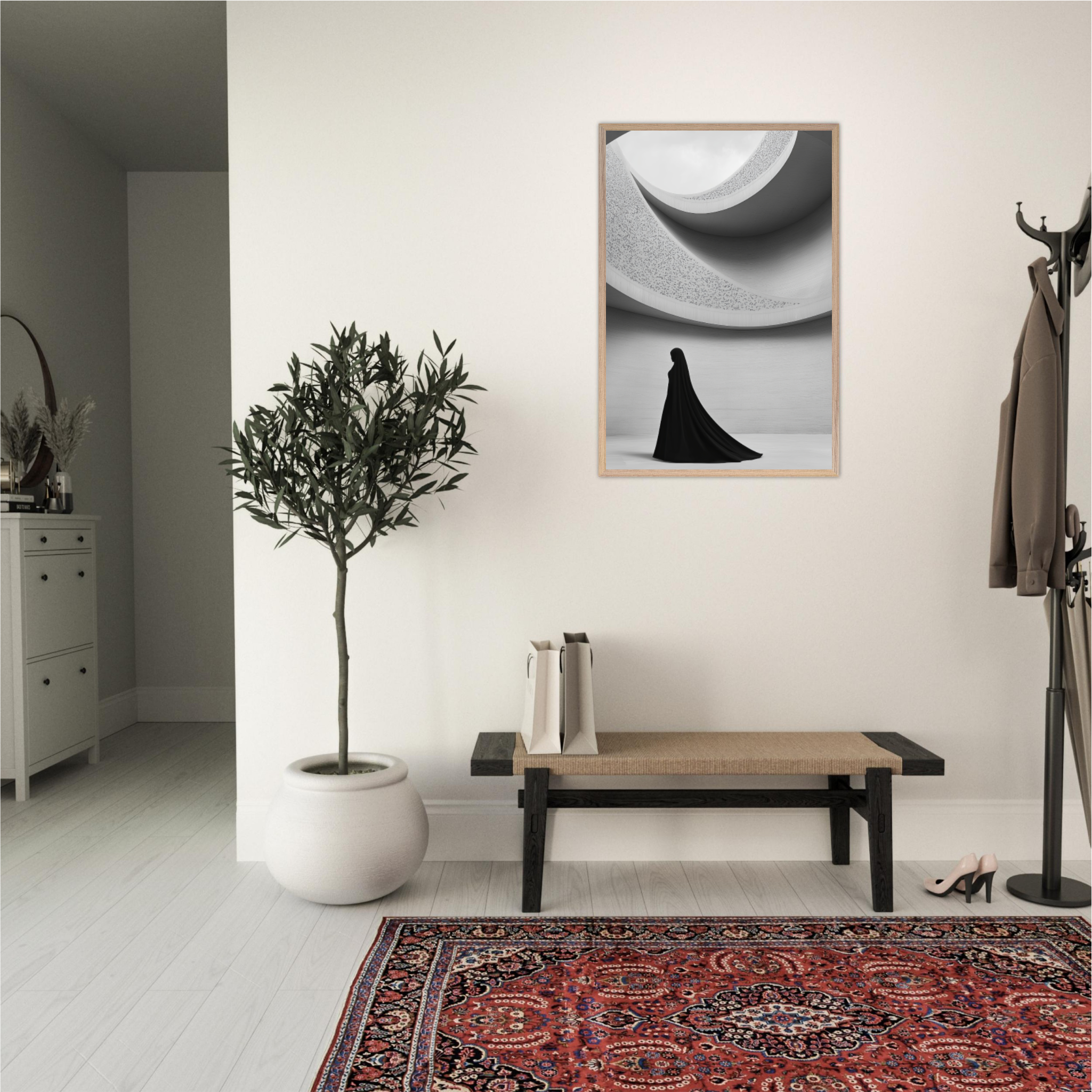 Find yourself in ‘Silhouette of Faith’, a stunning celebration of contemporary Islamic architecture that bridges tradition with innovation. This sophisticated piece presents a striking silhouette of modern mosque design rendered in elegant grayscale tones, emphasising how contemporary architects honour Islamic principles whilst embracing bold new forms. The photorealistic technique captures every nuance of light and shadow, creating depth and dimensionality that draws viewers into contemplation of sacred space. The monochrome palette ensures timeless appeal whilst highlighting architectural details. Perfect for design-conscious Muslim homes seeking art that celebrates both aesthetic excellence and spiritual purpose, demonstrating how Islamic architecture continues evolving whilst maintaining its essential character.